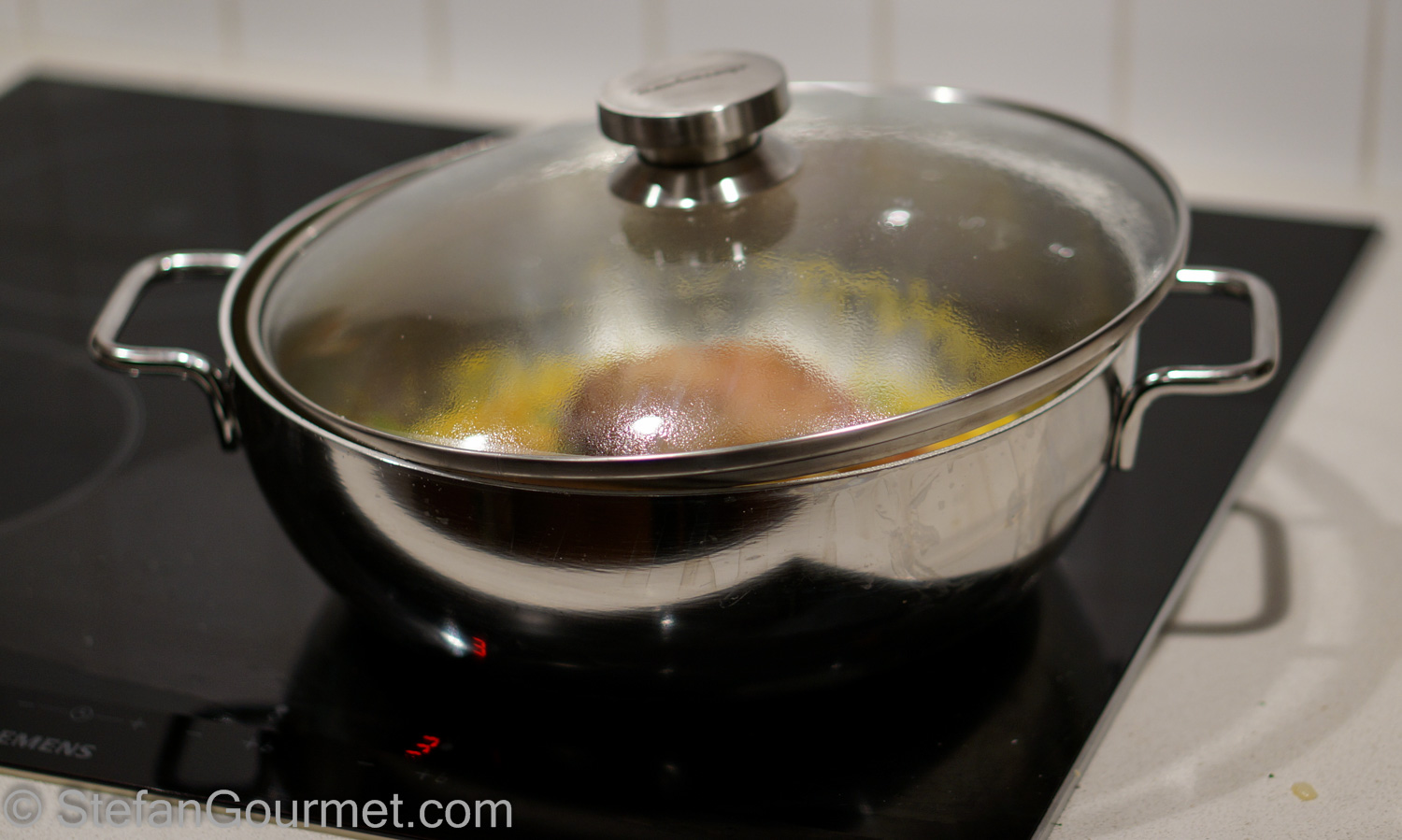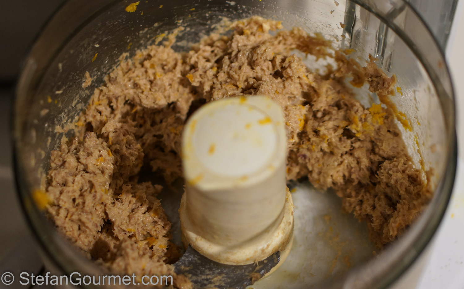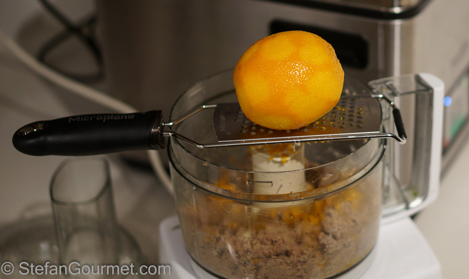 For yesterday’s post with tips for making homemade ravioli I needed some photos, and prepared a filling with duck and orange. First I braised duck legs in orange juice with the ‘holy trinity’ of onion, carrot, and celery as well as thyme, sage, and rosemary. Then I used the meat of the duck legs for the filling, together with orange zest and the pan juices to enrich the filling. I used the remaining pan juices to dress the ravioli. The result was wonderful and definitely something to add my ever growing ravioli repertoire. The combination of duck and orange is well known, and also in this preparation it definitely works. Here’s what I did…