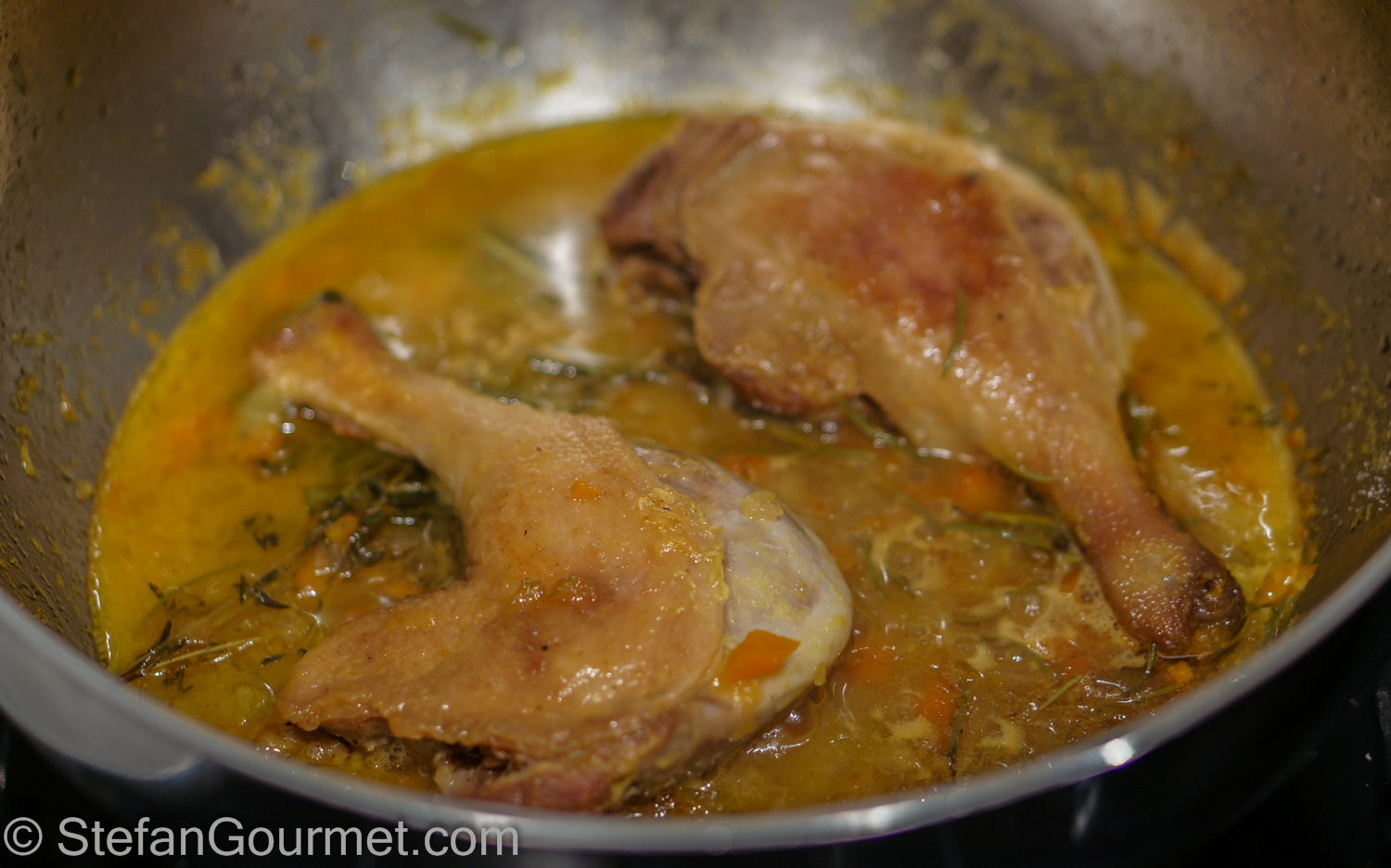 Add the duck legs including the juices that leaked out of them. We don’t want to waste any flavor!