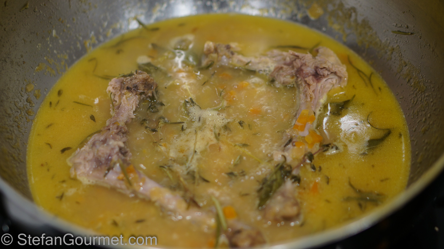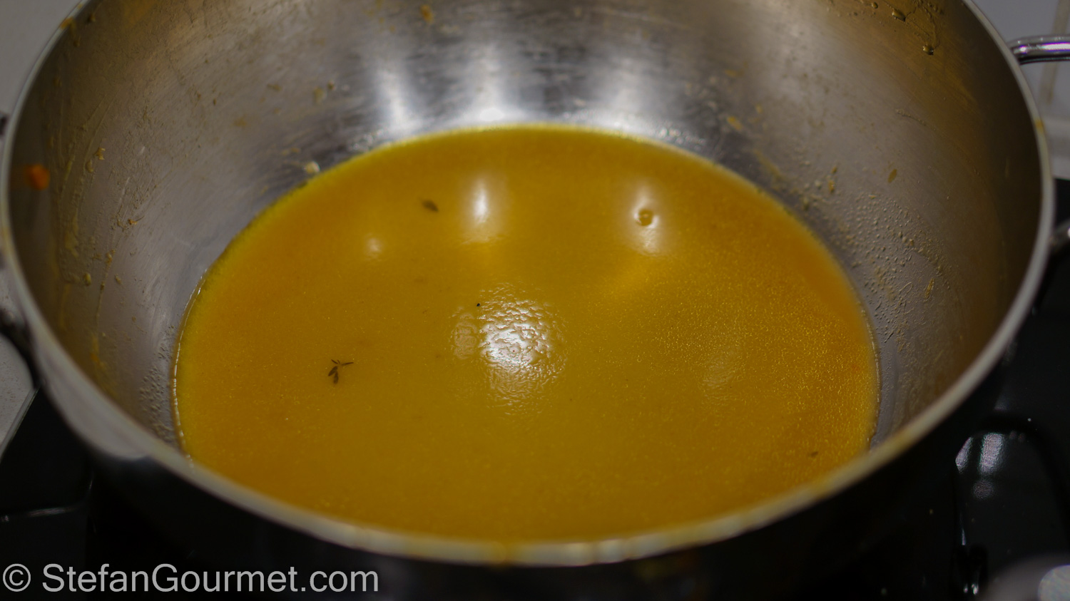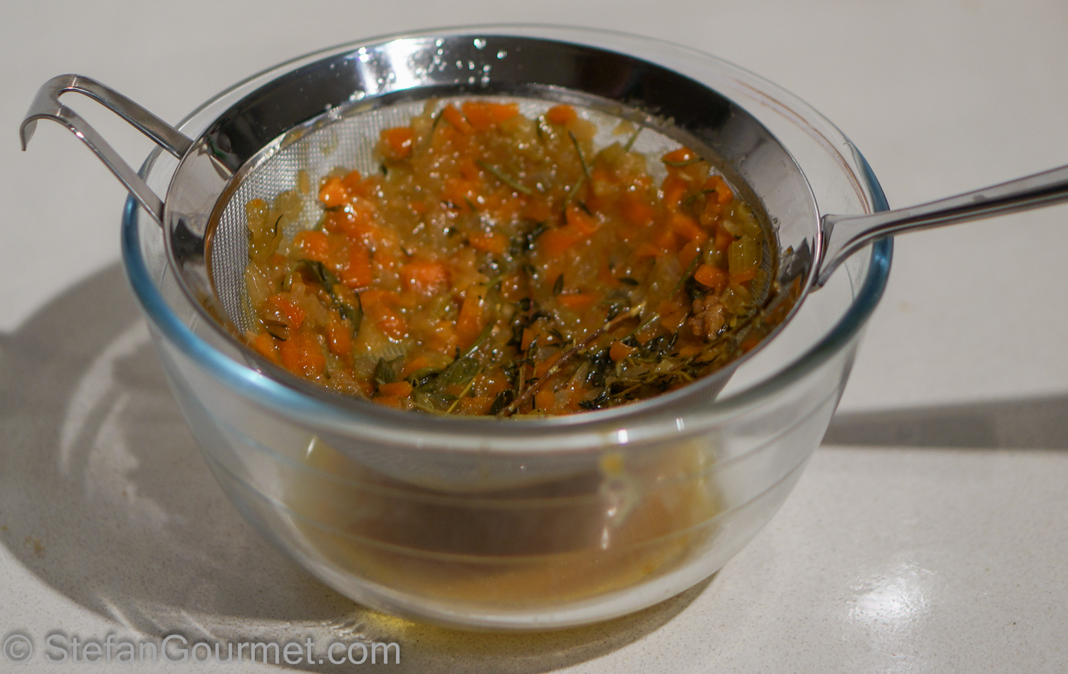 Return the remaining juices to the pan together with the bones and the aromatics that were sieved out of the juices. Add 250 ml (1 cup) of water, bring to a boil, and reduce to very low heat. Continue to simmer this until there is about 125 ml (1/2 cup) of juices left, then sieve the juices again.