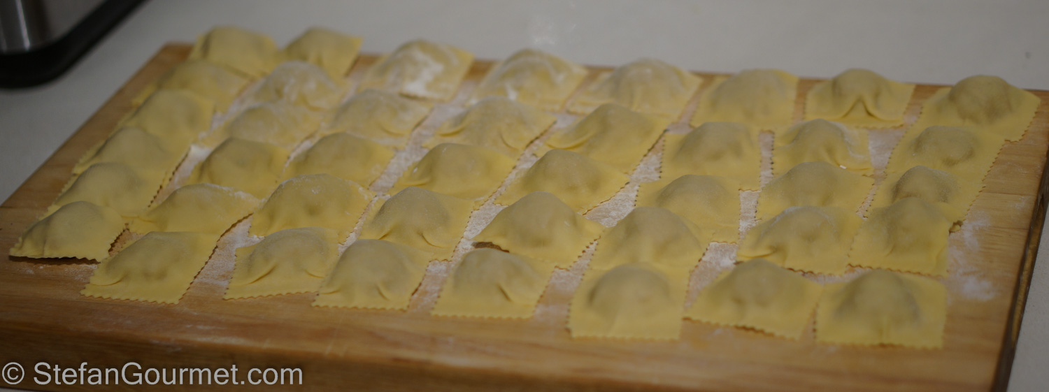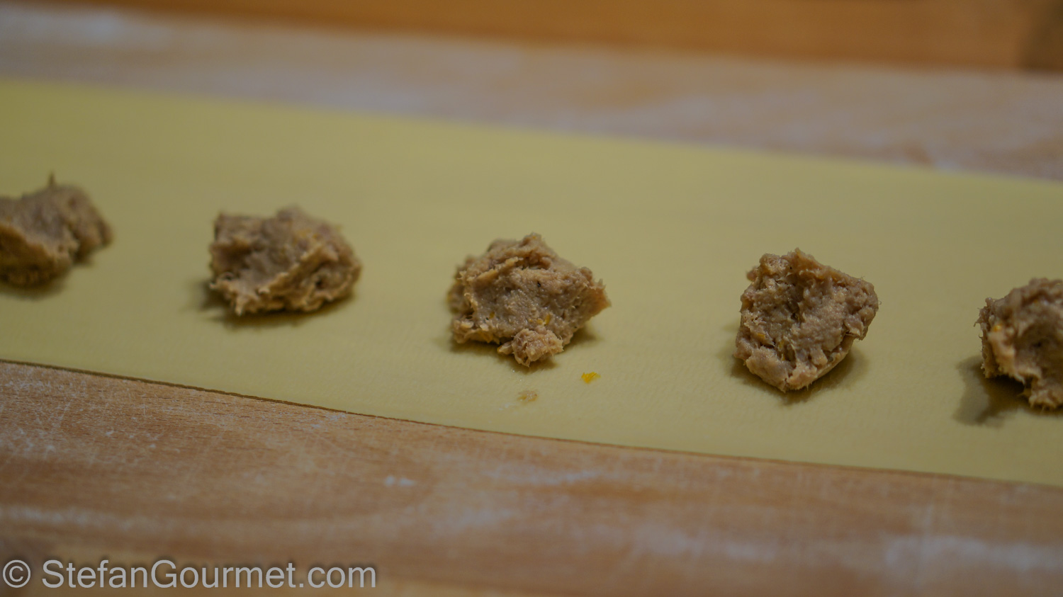 When the pasta dough has rested and the filling has firmed up, roll out the pasta dough and make ravioli.