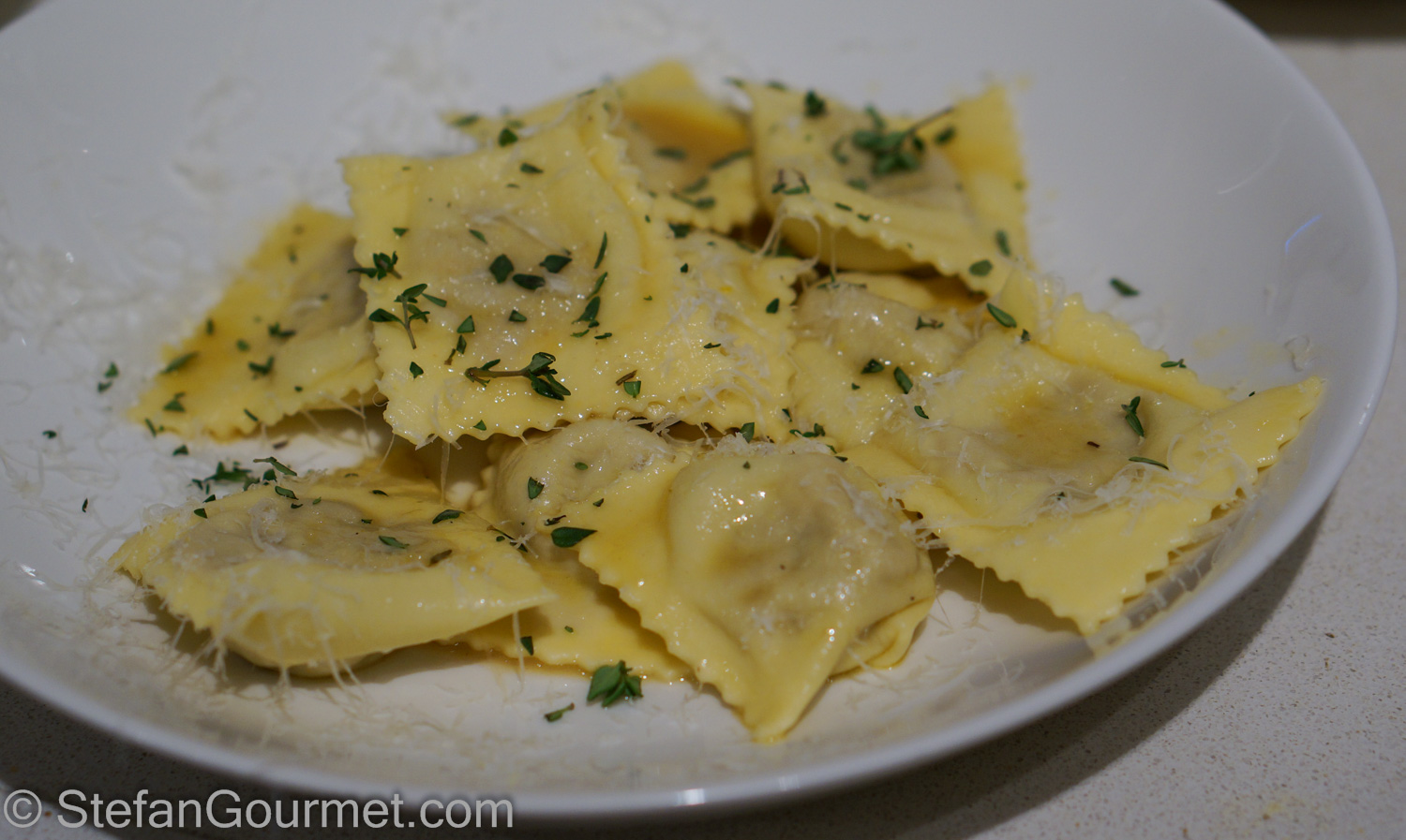 Serve the ravioli on preheated plates. Spoon over any remaining juices, and sprinkle with fresh thyme leaves and freshly grated parmigiano.