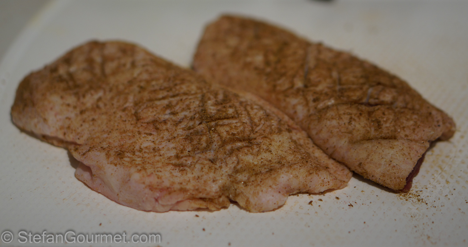 With a sharp knife, score the skin of the duck breast fillets in a diamon pattern. Try to avoid cutting into the meat, just the skin.