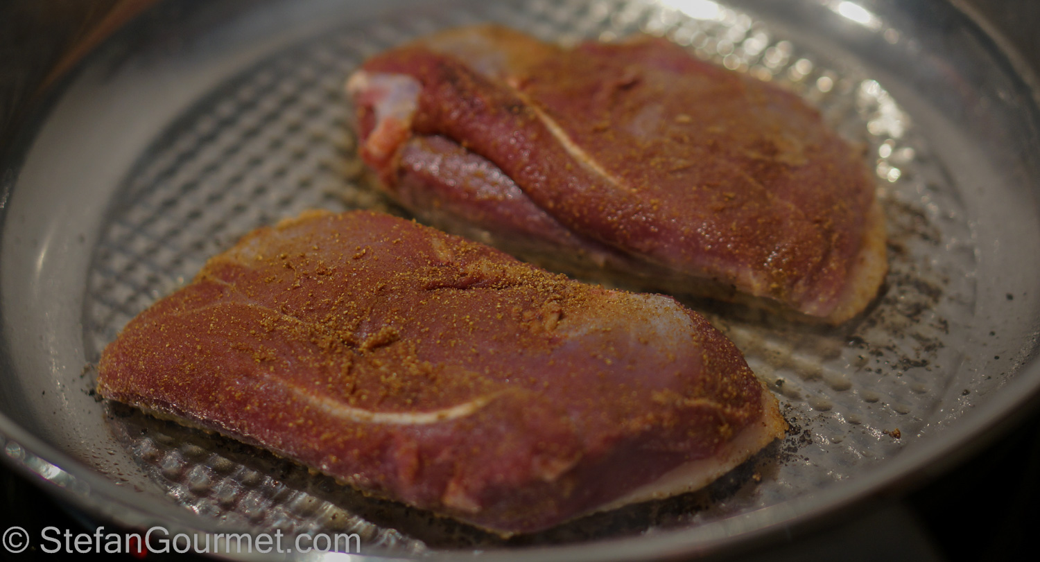 Render some of the fat from the fat side of the duck breast fillets over medium high heat in a dry frying pan, about 4 minutes. Then quickly brown the other side as well.