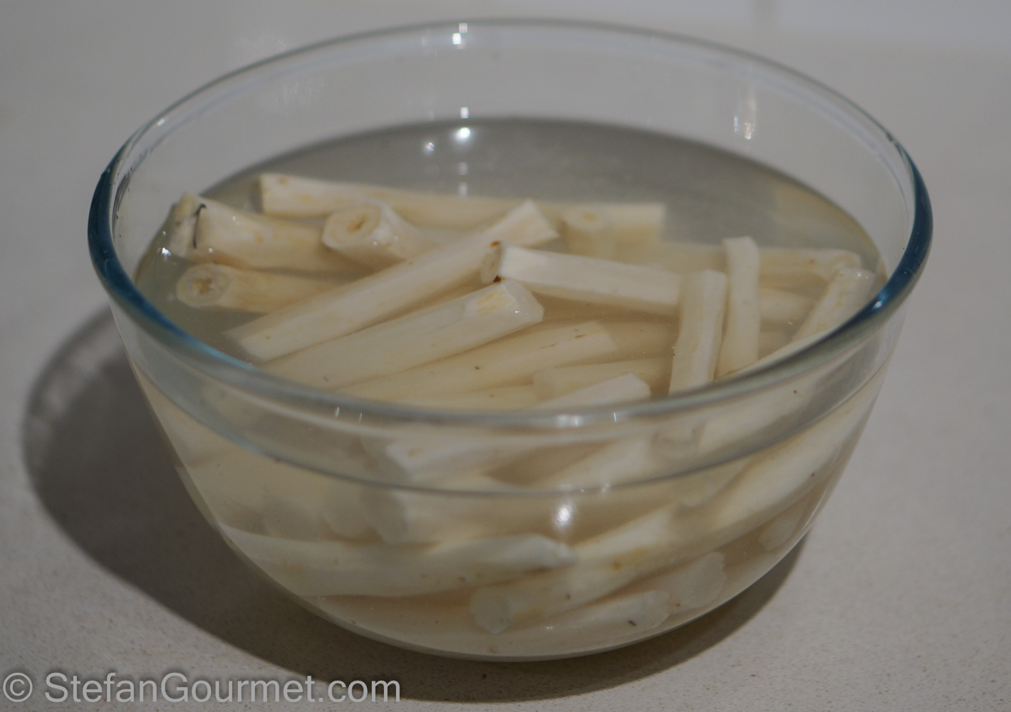 Peel the salsify (use gloves to avoid staining your hands), cut them into 10 cm (4 inch) lengths and put them in a bowl of water to which you have added some lemon juice or vinegar to prevent discoloring.
