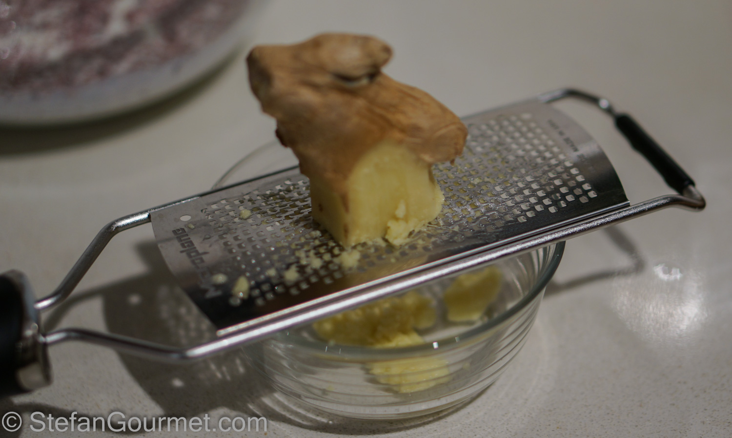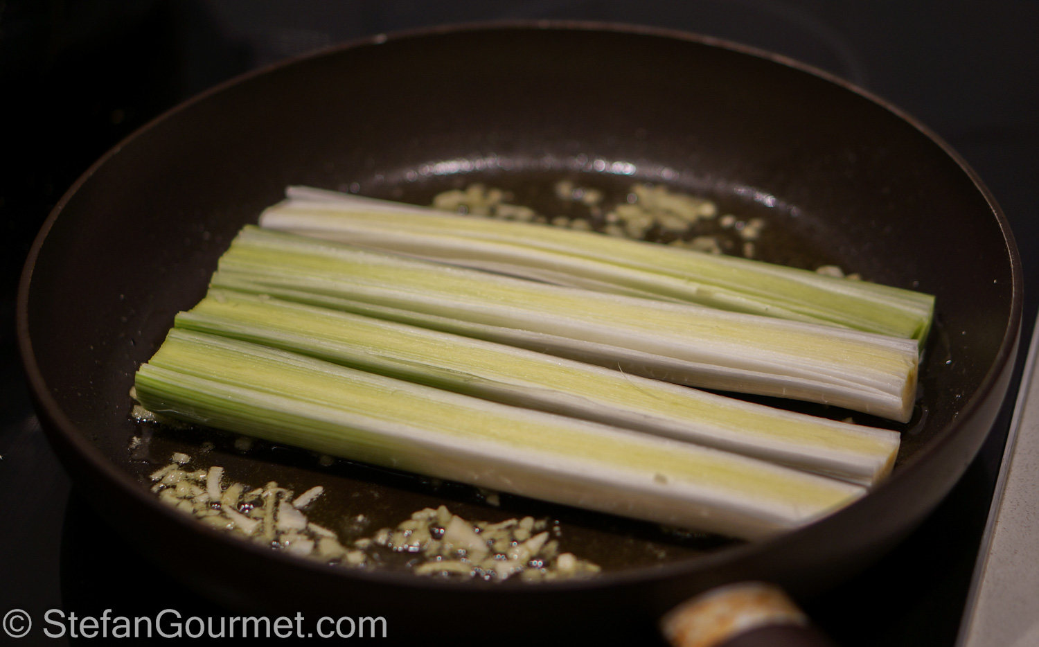 Wash and trim the leeks such that you use only the white and light green part, and they fit in your frying pan. Cut each leek into halves lengthwise. Melt 2 Tbsp of the butter in the frying pan, add 1 minced garlic clove and the minced ginger…