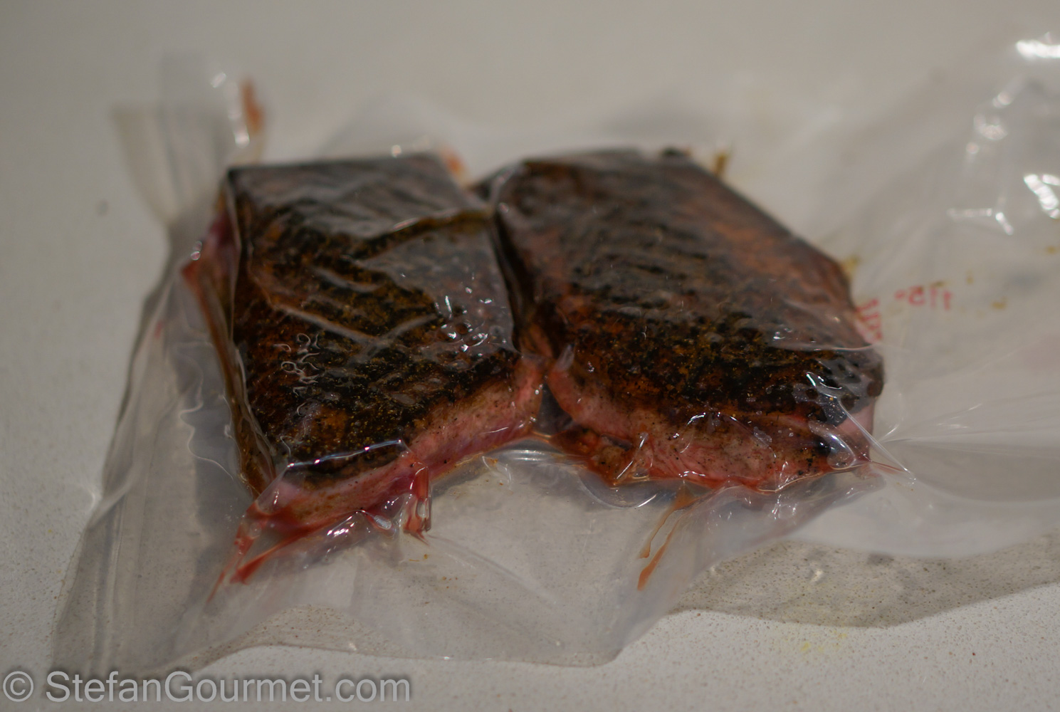 When cooking the duck sous-vide as well, vacuum seal once the duck is cold (when you try to vacuum seal the duck while it is still warm from rendering the fat, the combination of high temperature and low pressure will result in boiling the juices) and cook sous-vide for 2 hours at 57ºC/135ºF.