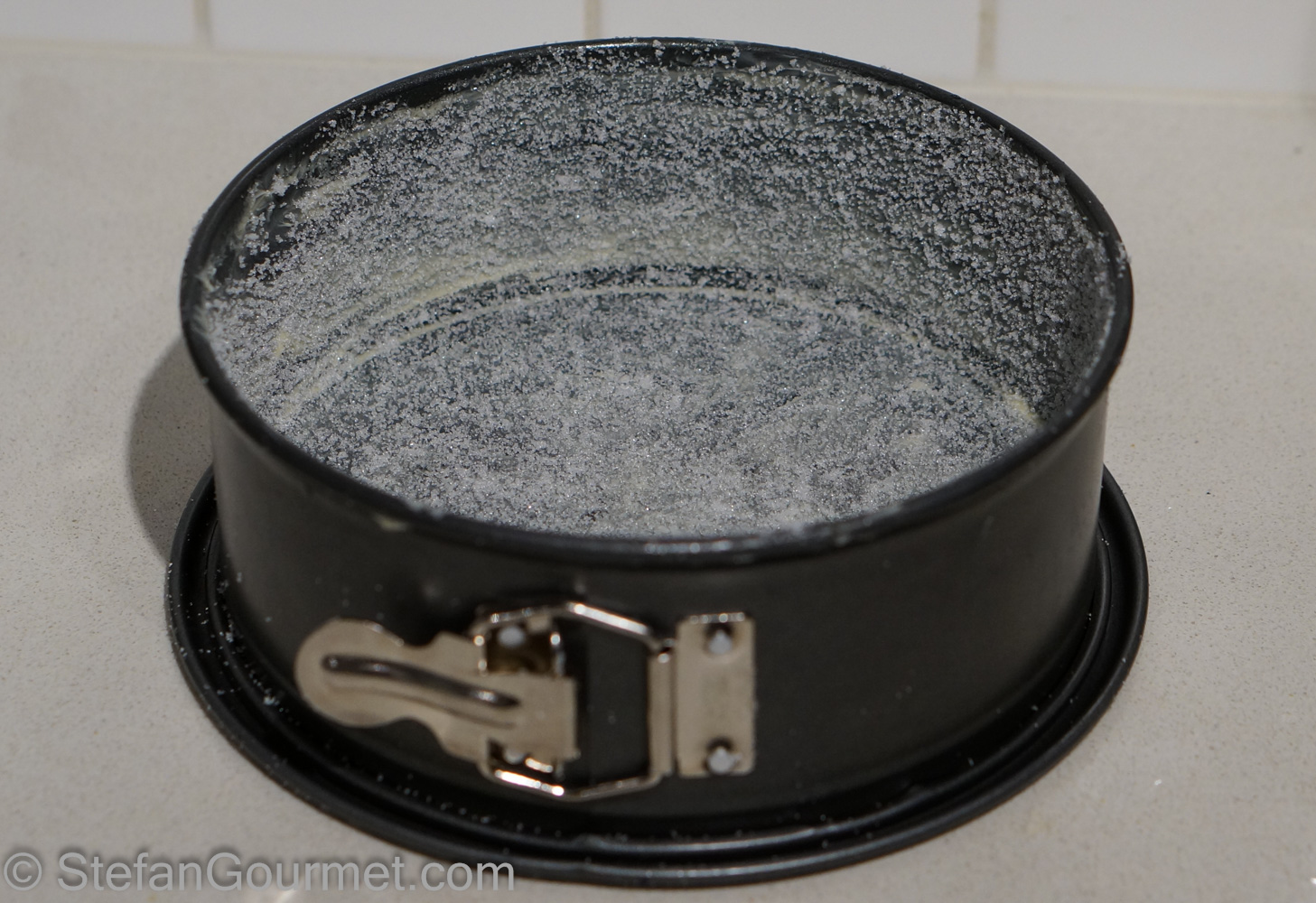Butter a 20 cm (8 inch) cake pan and coat it with sugar (take the sugar from the sugar to be used for the cake).