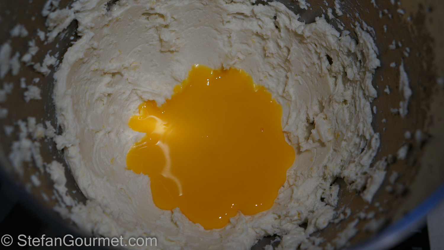 Carefully fold in the beaten egg white in three additions with a rubber spatula, working from below. Try to keep the mixture as airy as possible.