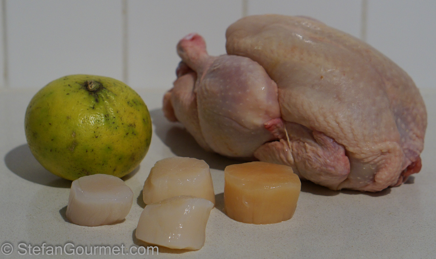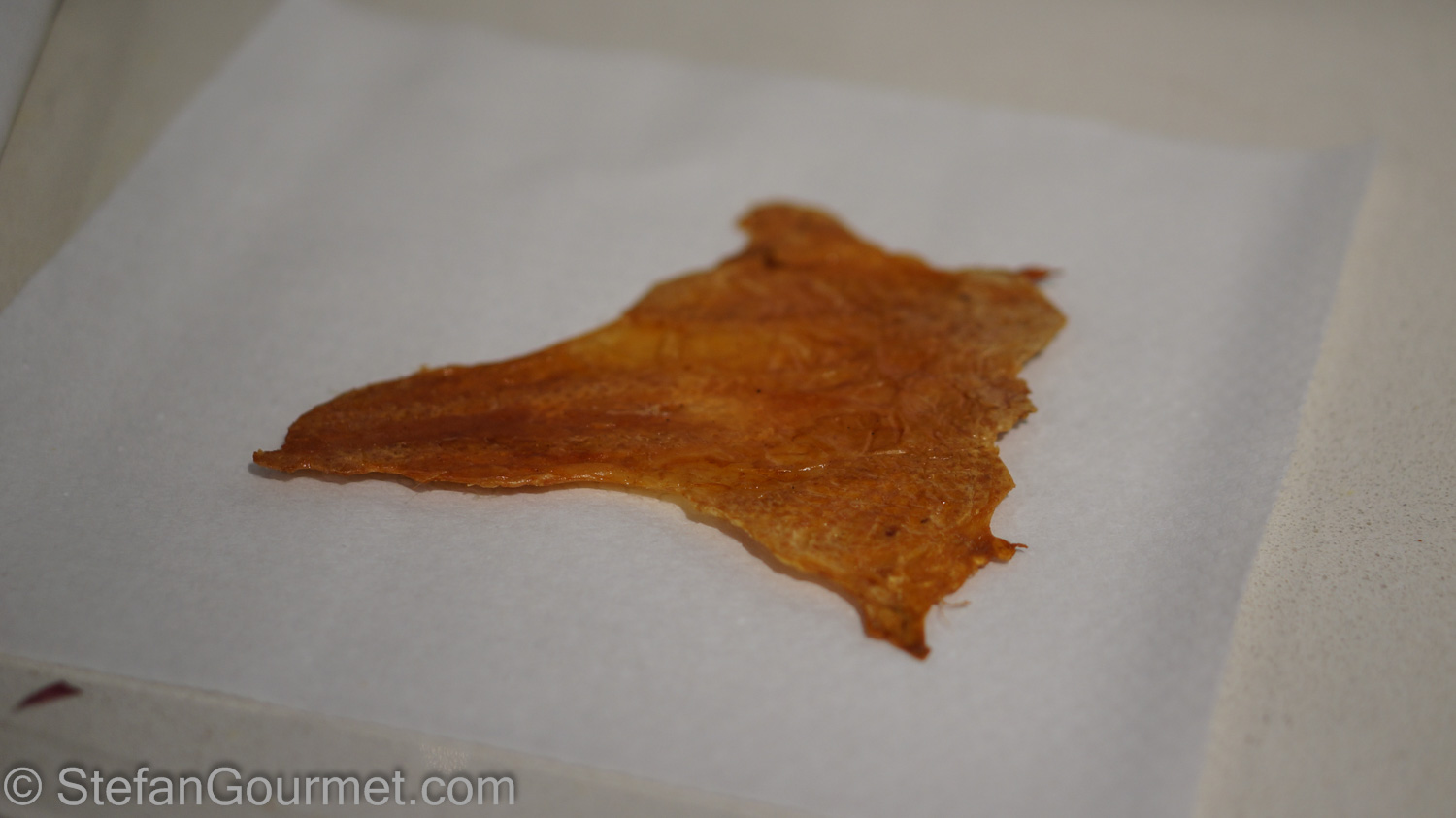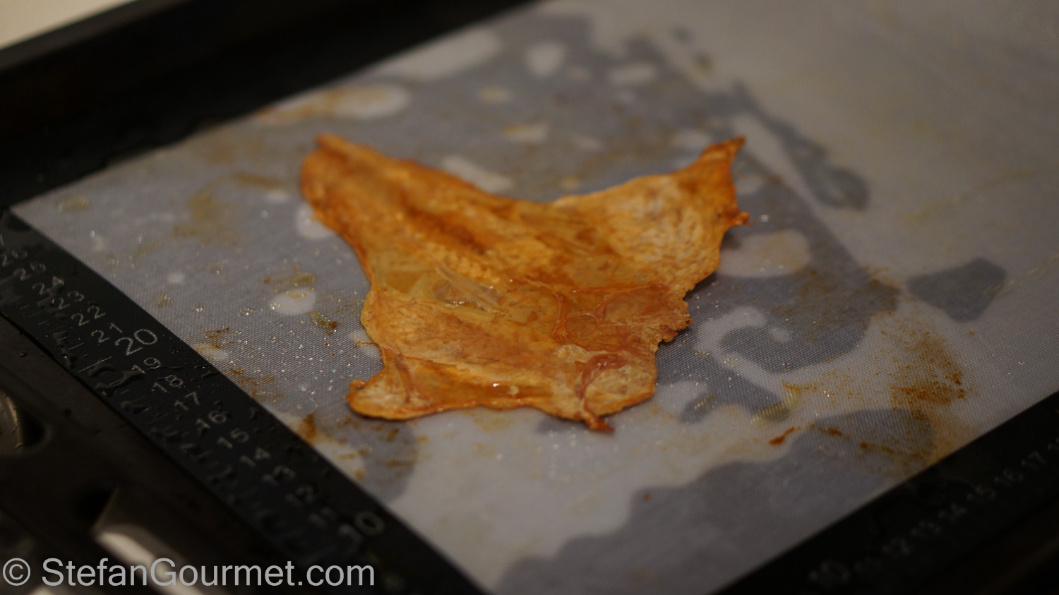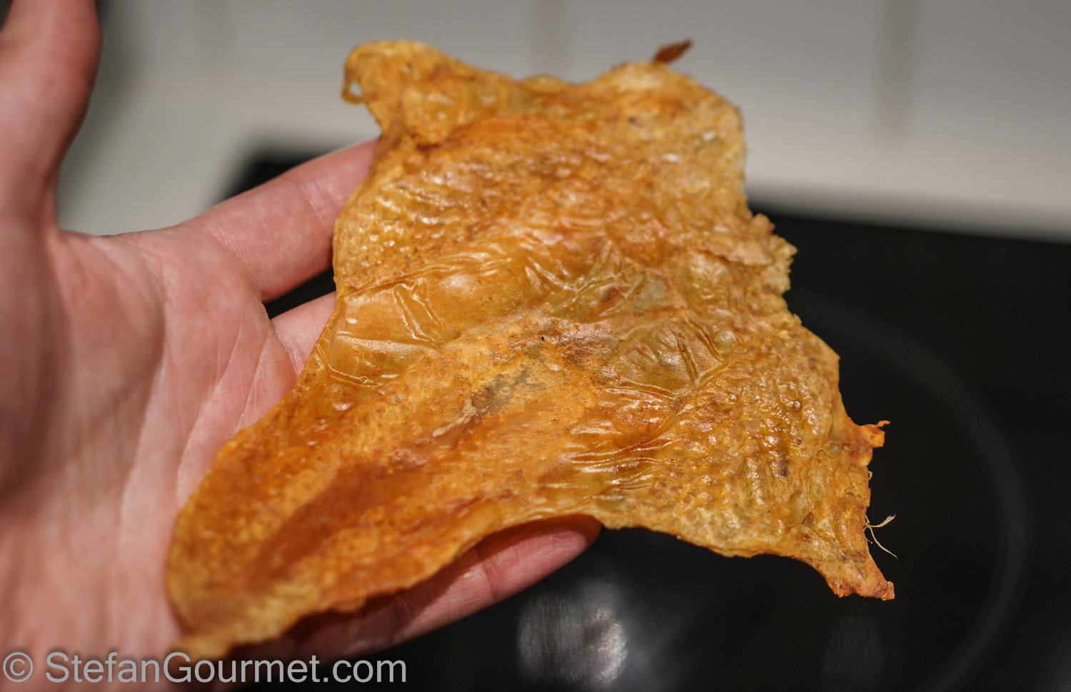 My dish is more simple than what was served at Devero. I couldn’t find yuzu, so I decided to use the most exotic citrus I could find instead, a bergamot orange. I wanted to garnish with green shiso leaves for color, but those were sold out. I decided to allow the chicken stock to firm up so I could use it as a base for the crispy chicken skin to stand up. Of the bergamot orange I simply used the juice and zest. The dish ended up quite different from what we had at Devero, but very nice indeed with a good combination of flavors and contrast between textures. It’s nice that the dish is only made from three ingredients! (Not counting a bit of salt.) Here’s what I did…