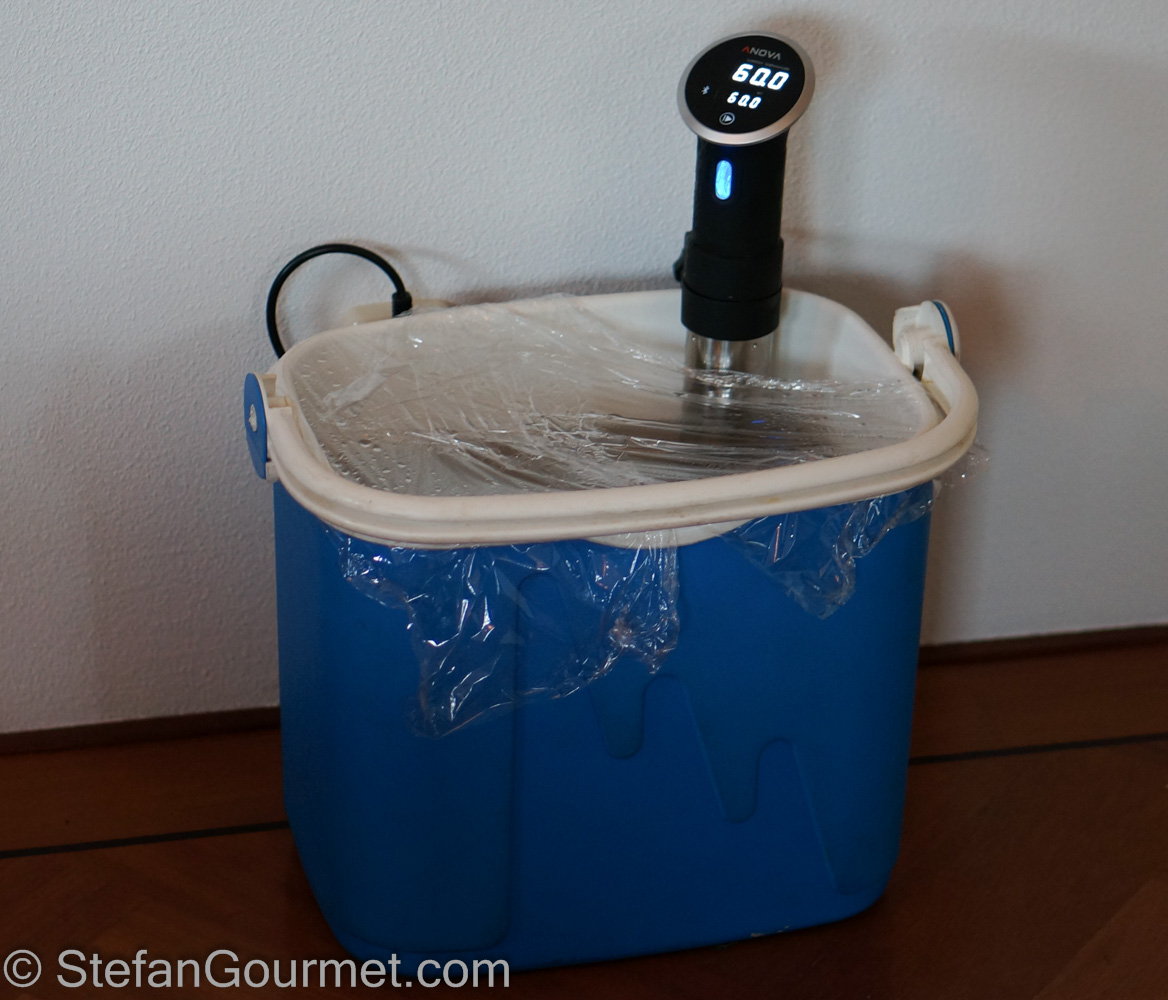 This was the first job for my new immersion circulator, as this amount of quail legs did not fit into my regular sous-vide cooker. I got the immersion circulator to be able to cook sous-vide at two different temperatures at the same time, to use a larger container as in this case, or to take it with me more easily.