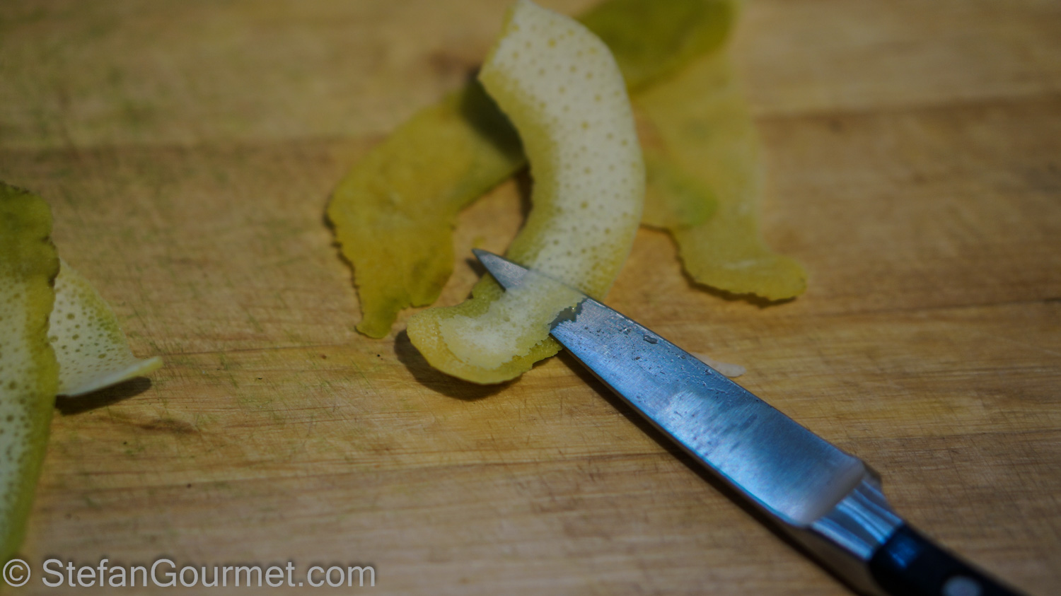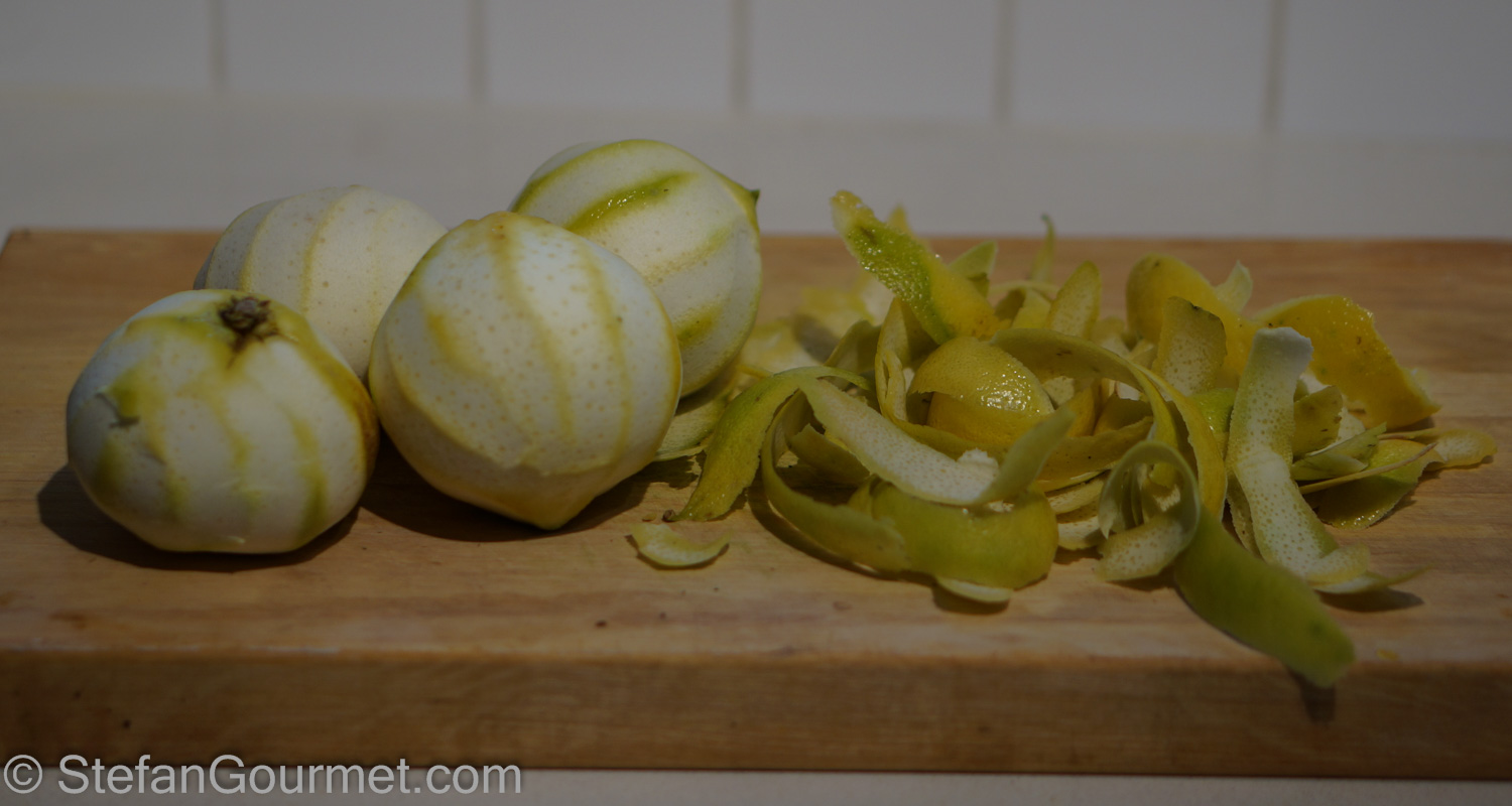 The most important thing to do (and most of the work) is to remove all of the white pith from the peels with a sharp paring knife. The white pith is bitter, you only want the yellow peel.