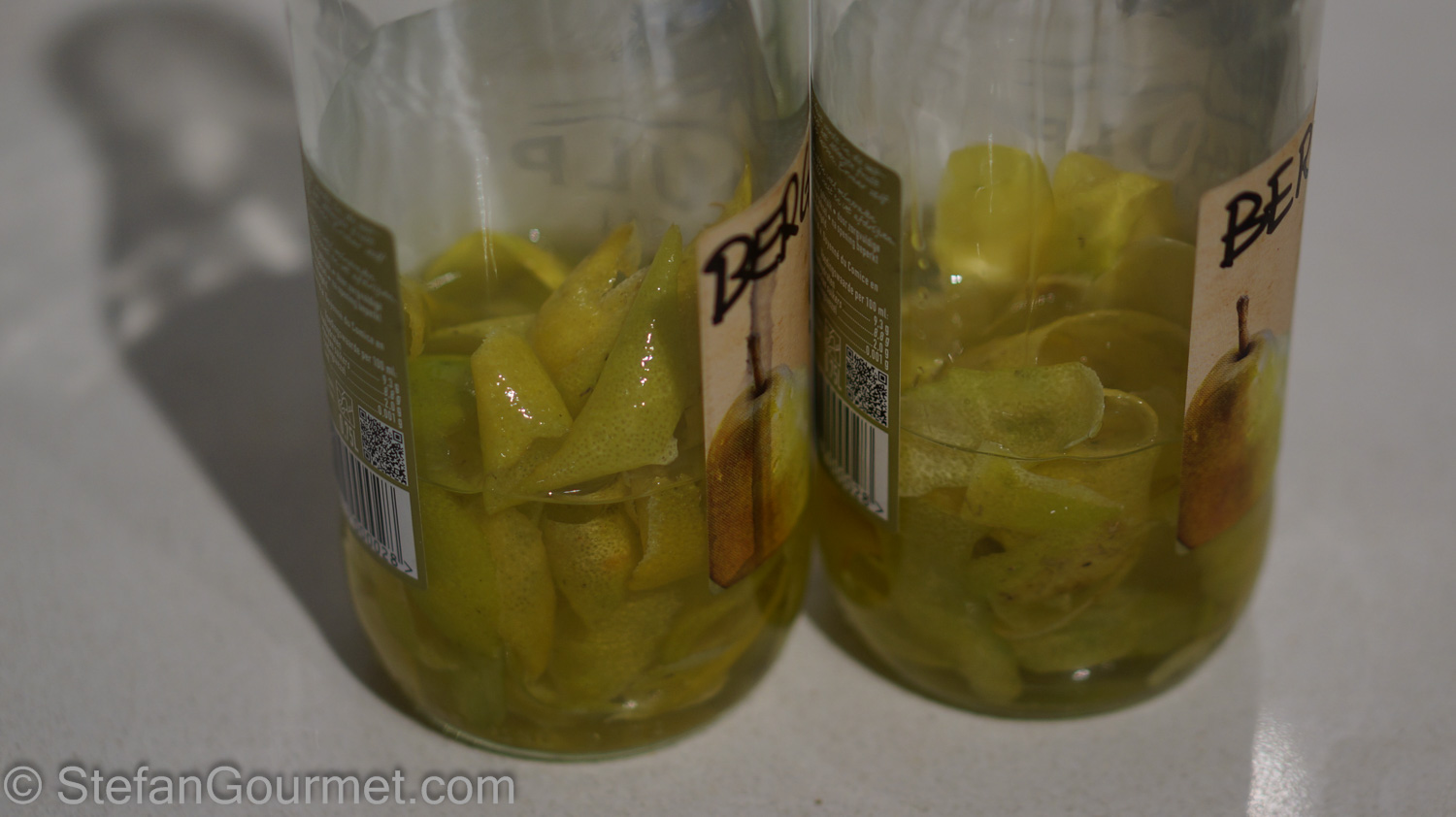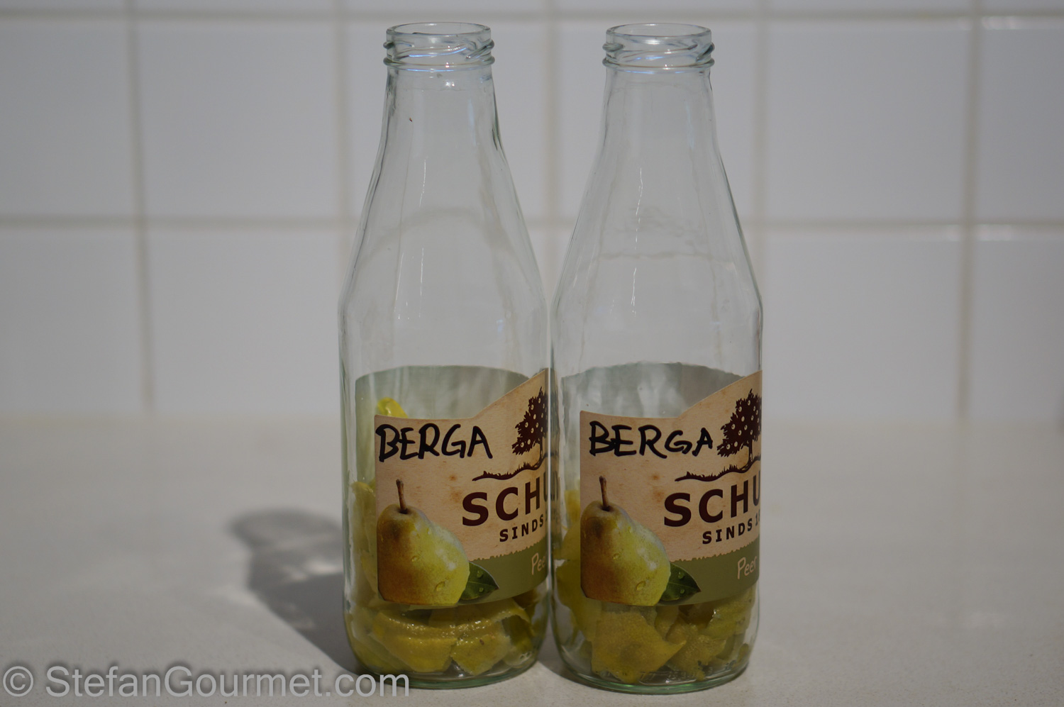 Put the peel in one 1.5 litre (6 cups) bottle, or 2 .75 litre (3 cups) bottles.