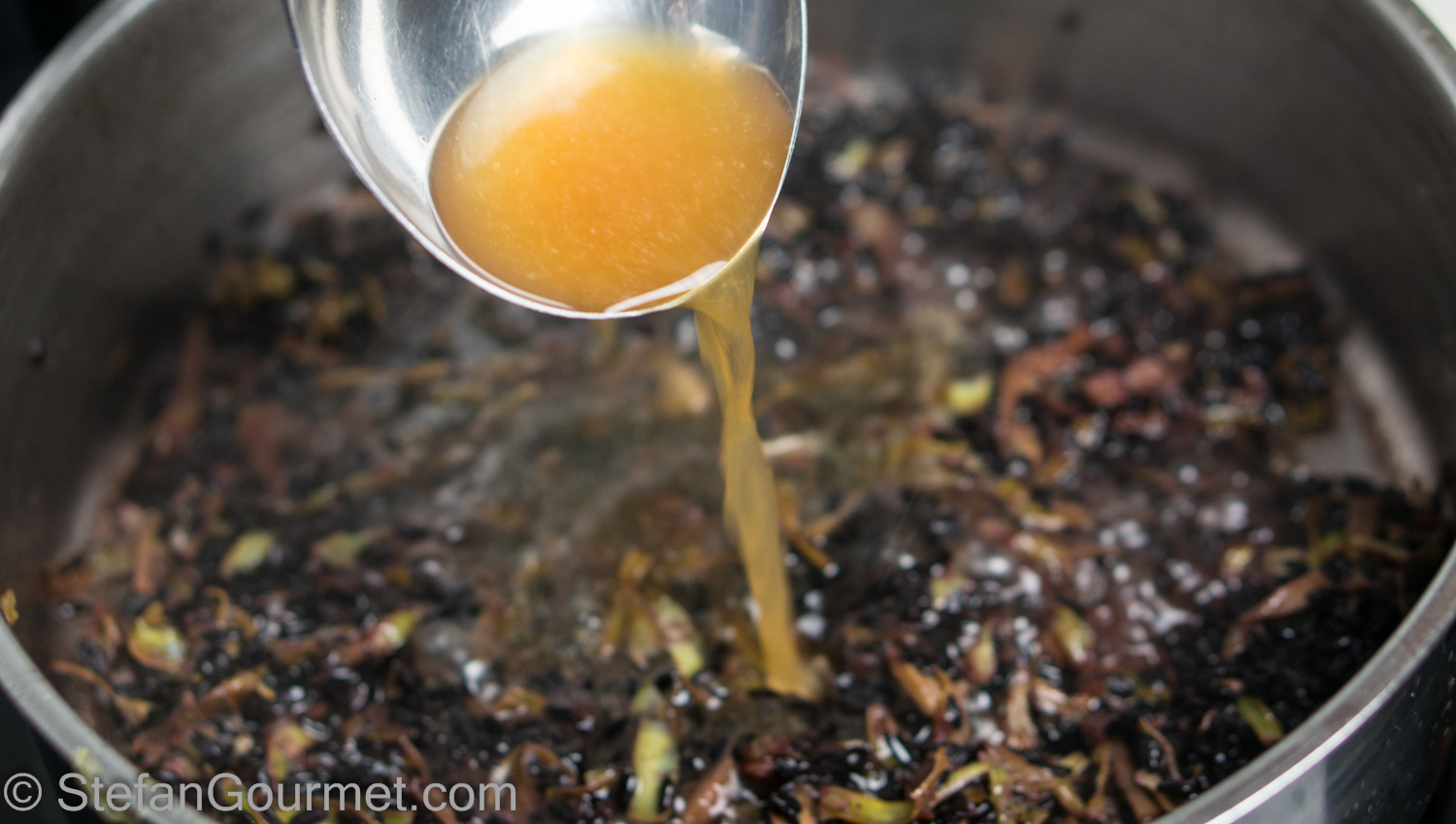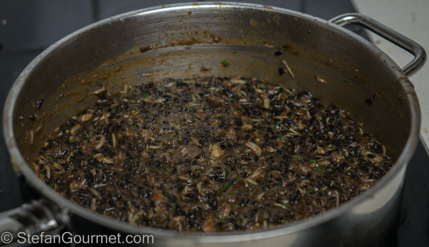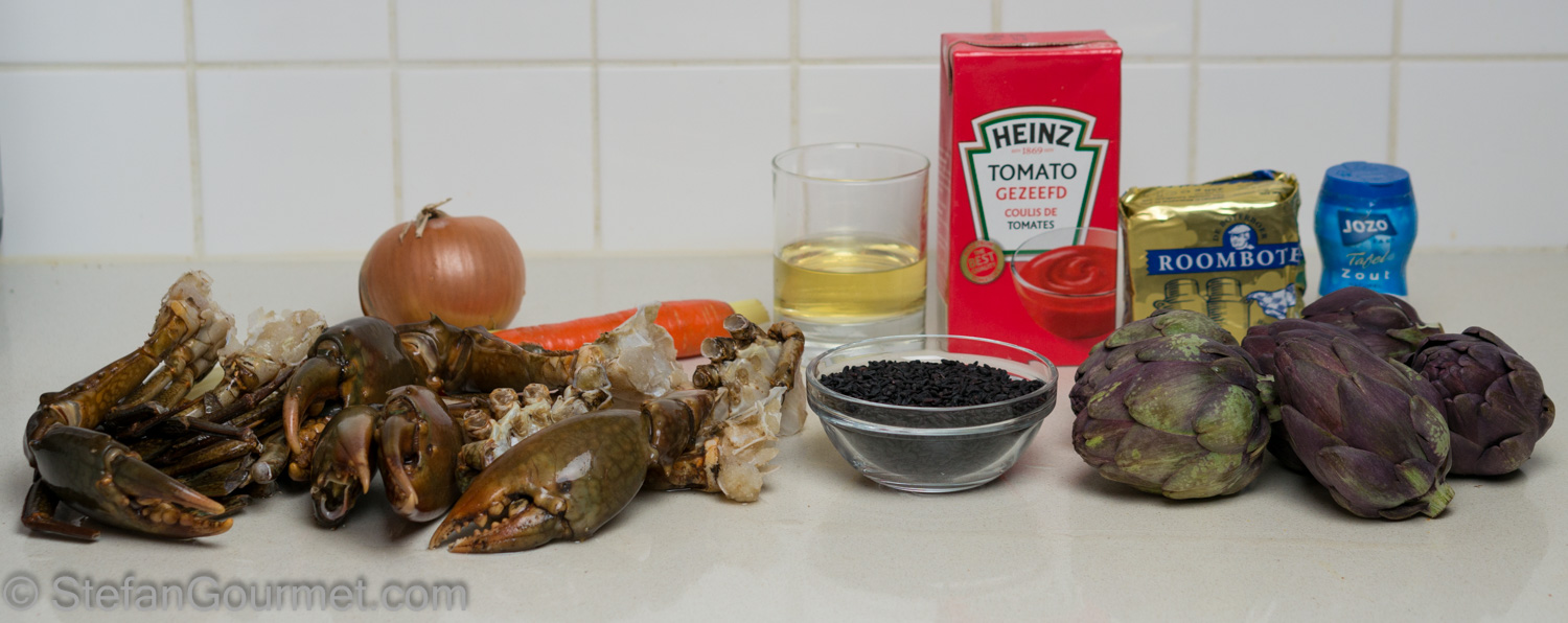 And you know what? It turned out delicious! Artichoke and crab do indeed go well together, and it also worked very well with the black rice. It all becomes one delicious new flavor with a great depth and balance. The black rice does not become as creamy as a regular risotto like carnaroli or arborio and it takes longer to cook, but otherwise this recipe works like a regular risotto. Instead of using crab from a tin, I used frozen crab legs, cooked them, picked the meat, and used the shells to make a stock for the risotto. Altogether it is quite a bit of work, about two hours from start to finish, but it’s worth it! This dish is very original and has great depth of flavor. Here’s what I did…