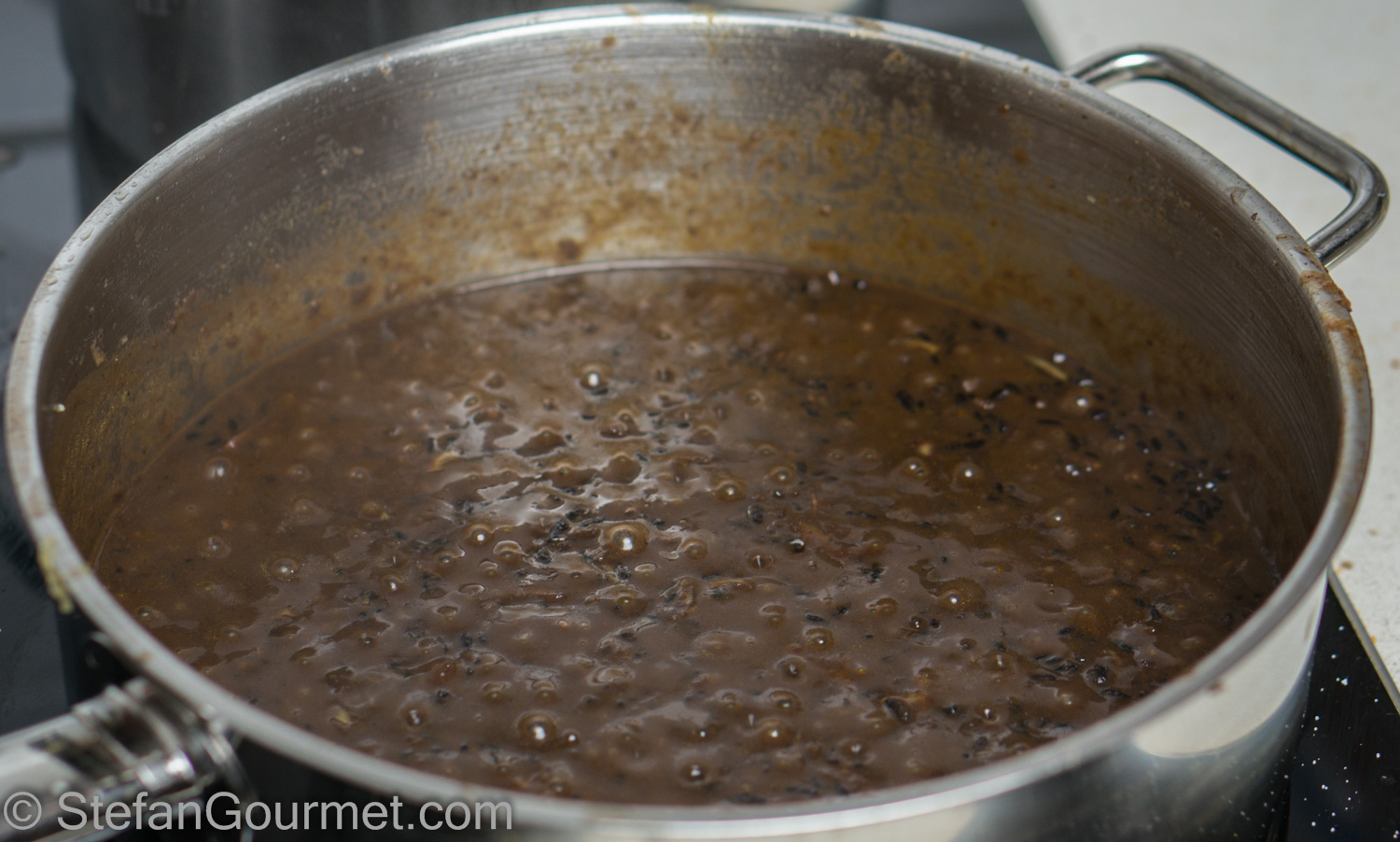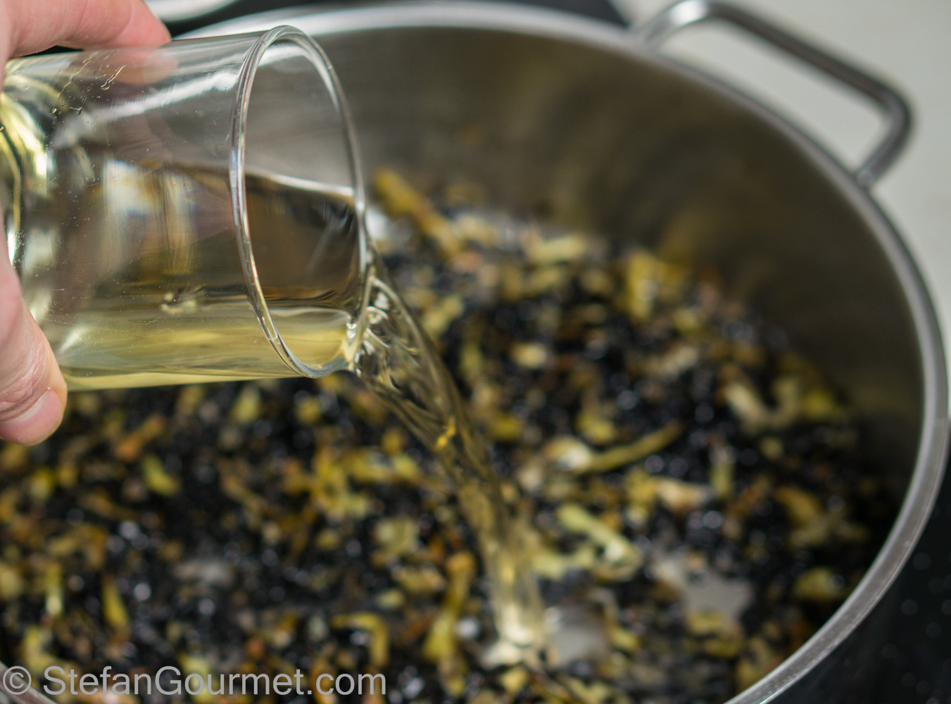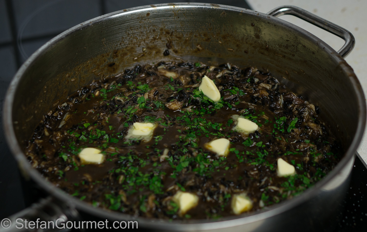 And you know what? It turned out delicious! Artichoke and crab do indeed go well together, and it also worked very well with the black rice. It all becomes one delicious new flavor with a great depth and balance. The black rice does not become as creamy as a regular risotto like carnaroli or arborio and it takes longer to cook, but otherwise this recipe works like a regular risotto. Instead of using crab from a tin, I used frozen crab legs, cooked them, picked the meat, and used the shells to make a stock for the risotto. Altogether it is quite a bit of work, about two hours from start to finish, but it’s worth it! This dish is very original and has great depth of flavor. Here’s what I did…