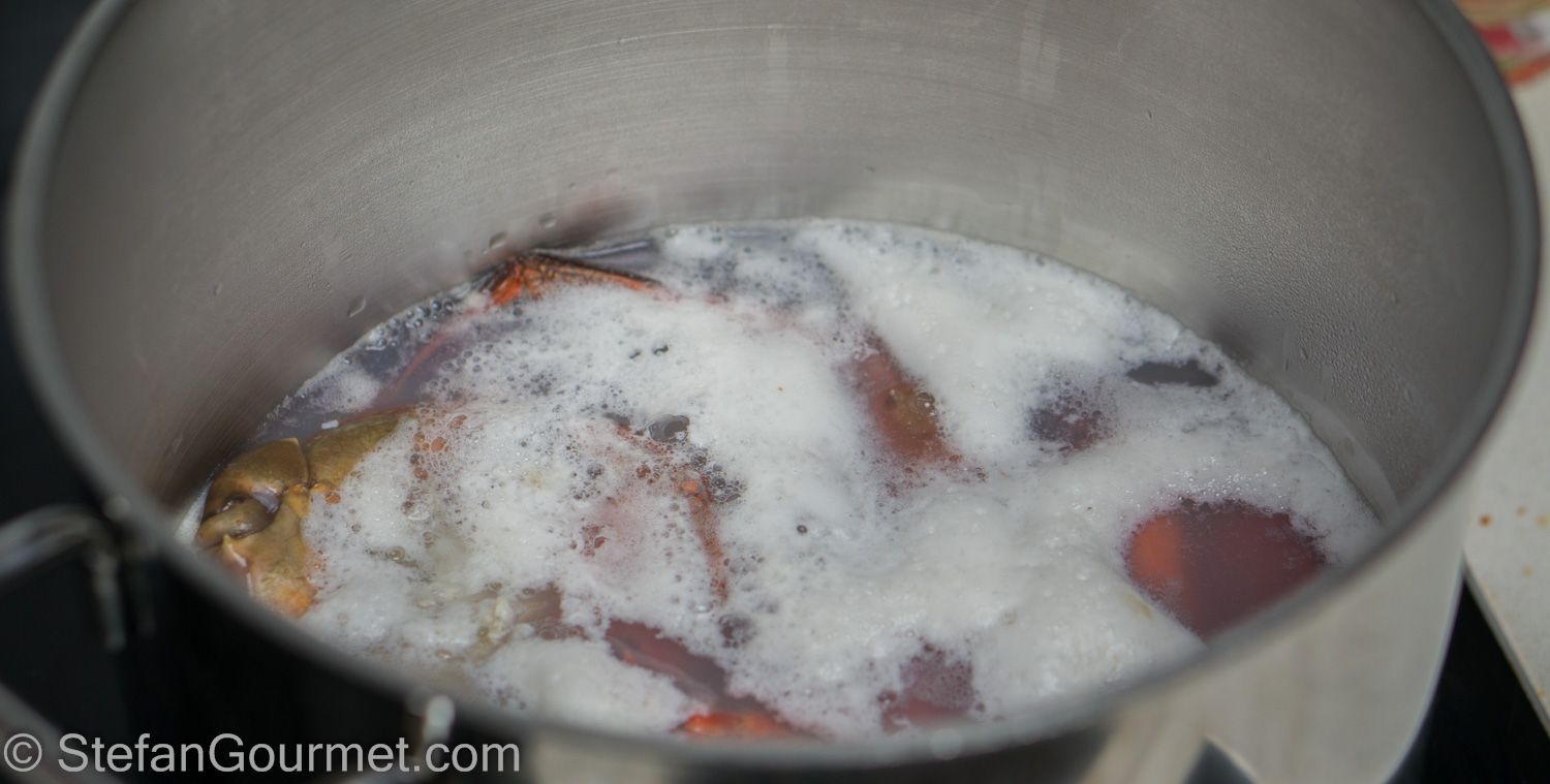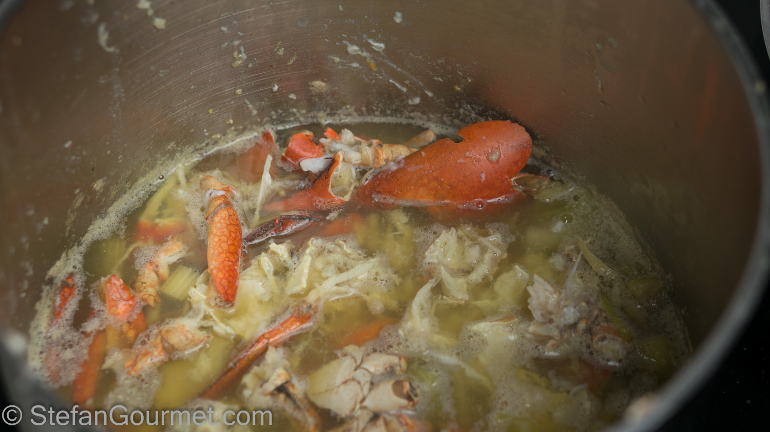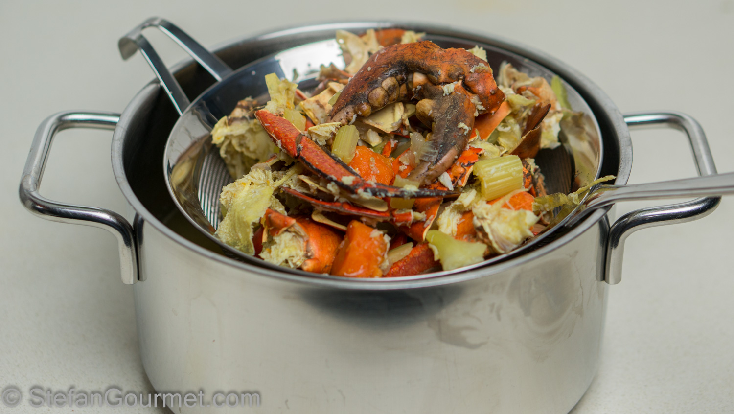 The crab stock is ready once it has simmered for about an hour (from the moment you added the vegetables. Sieve it with a fine sieve. You should have at least 750 ml (3 cups) of stock.