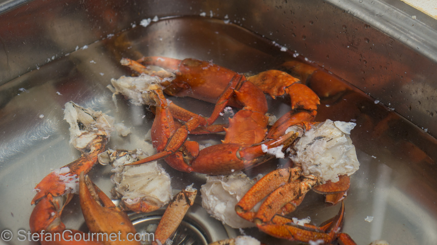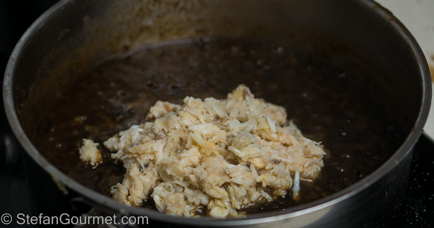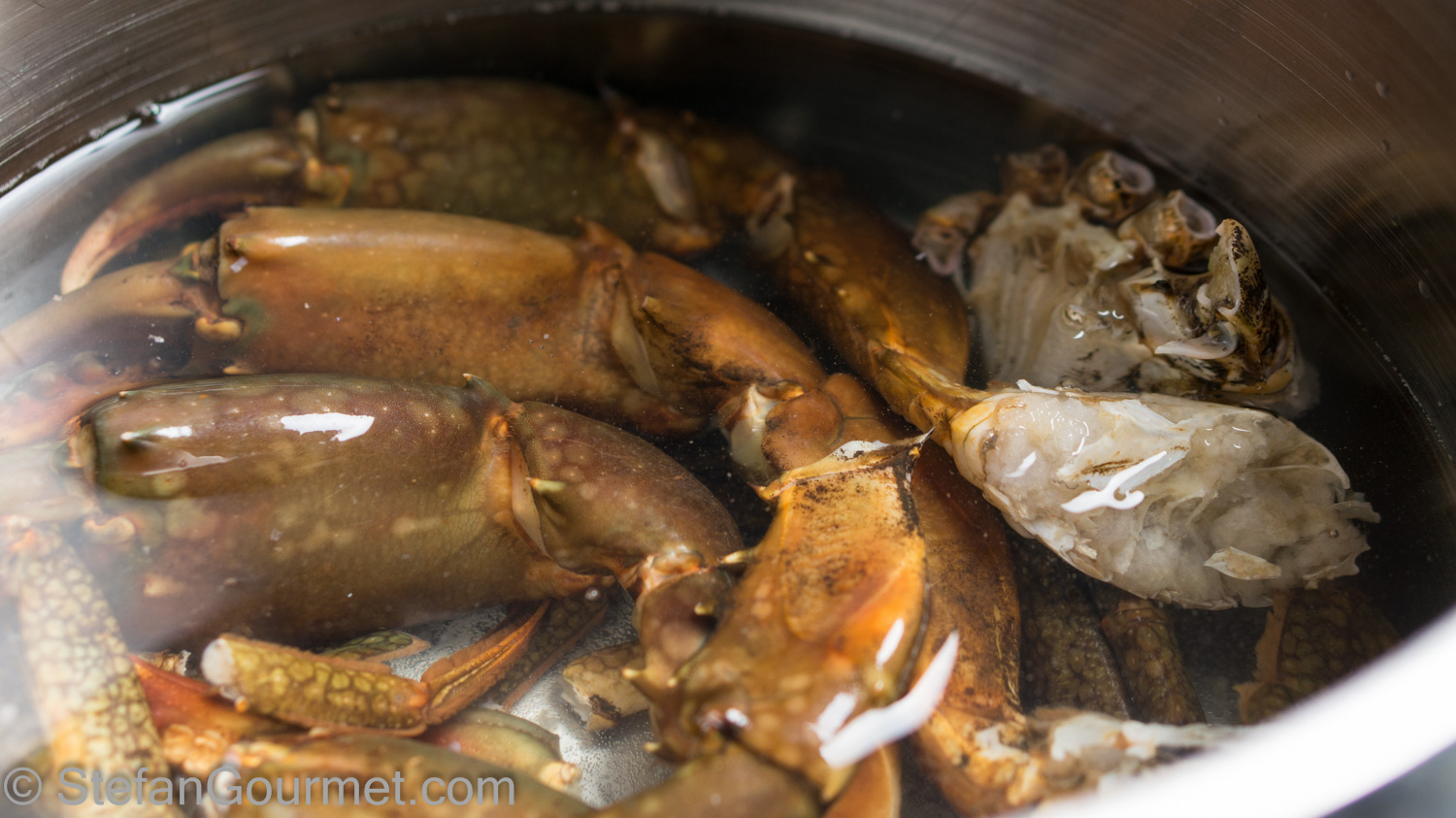 The crab stock is ready once it has simmered for about an hour (from the moment you added the vegetables. Sieve it with a fine sieve. You should have at least 750 ml (3 cups) of stock.