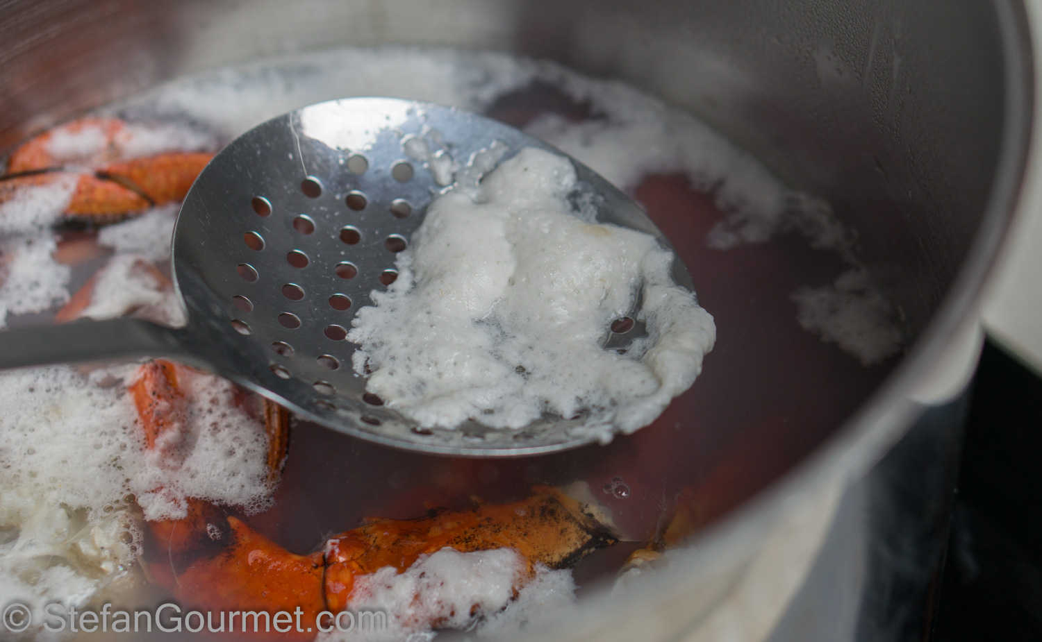Remove the scum that rises to the surface with a slotted spoon, and allow the crab legs to steep in the hot water for 15-20 minutes.