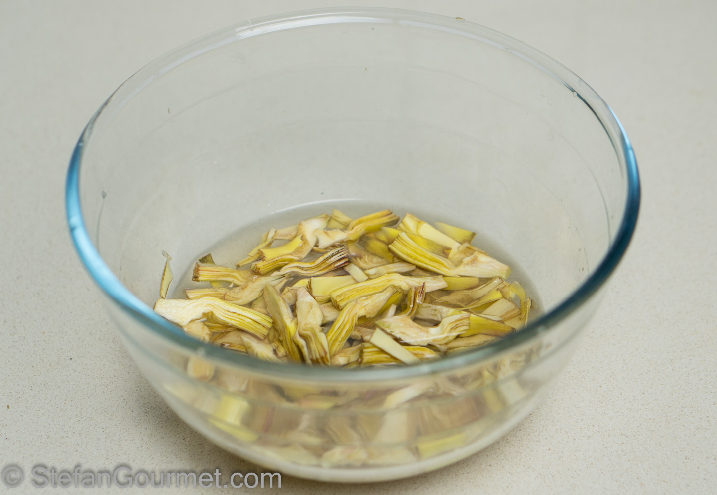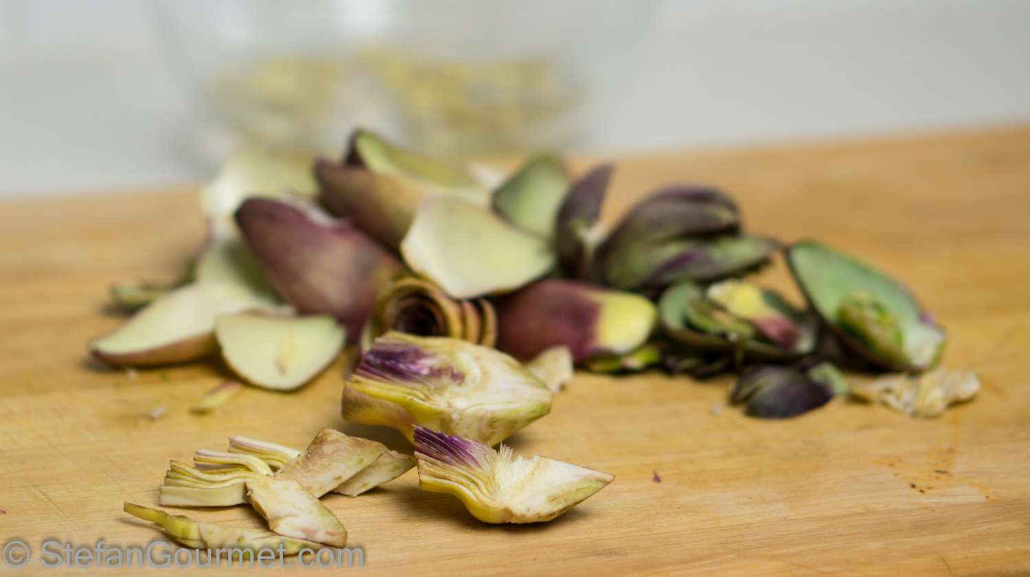 Meanwhile, clean the artichokes and slice them thinly. Since I used small artichokes, some part of the leaves was tender enough to be eaten as well.