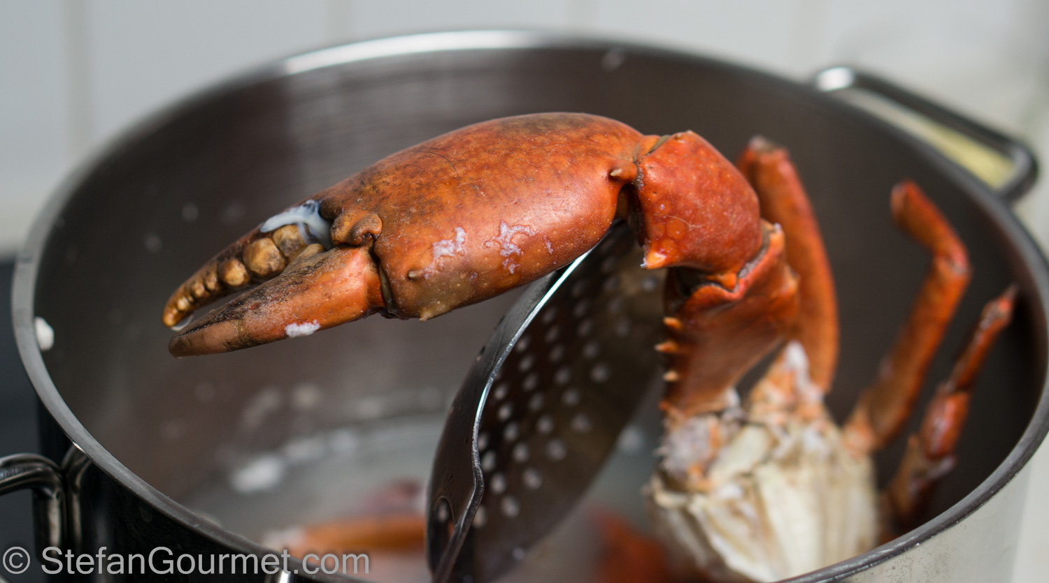 The crab should be done by the time you’ve finished the artichokes. Reserve the steeping water to make the stock later, and lift the crab legs from the water with a slotted spoon.