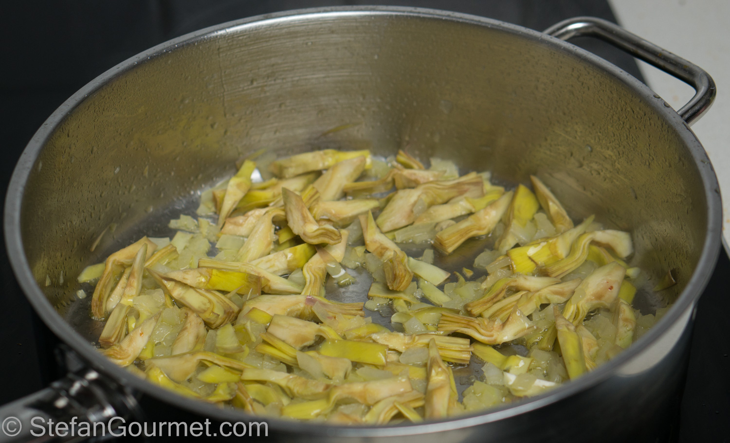 Meanwhile, melt 3 Tbsp butter in a frying pan. Mince half the onion and add it to the butter once it foams, together with the drained artichokes. Stir for a minute over medium heat and season with salt.
