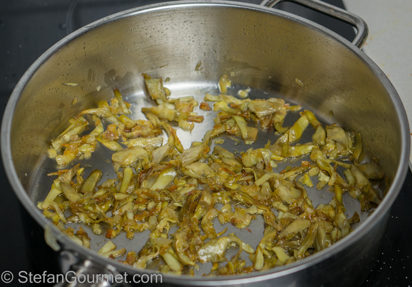 Lower the heat and cover. Cook the artichokes, stirring regularly to prevent them from burning, until they are tender.