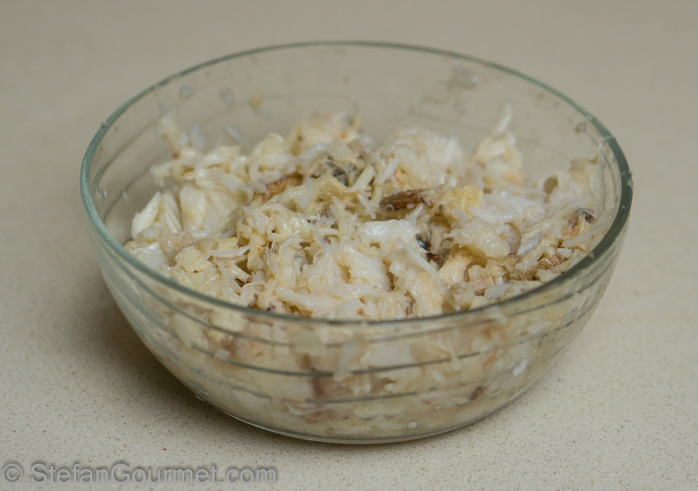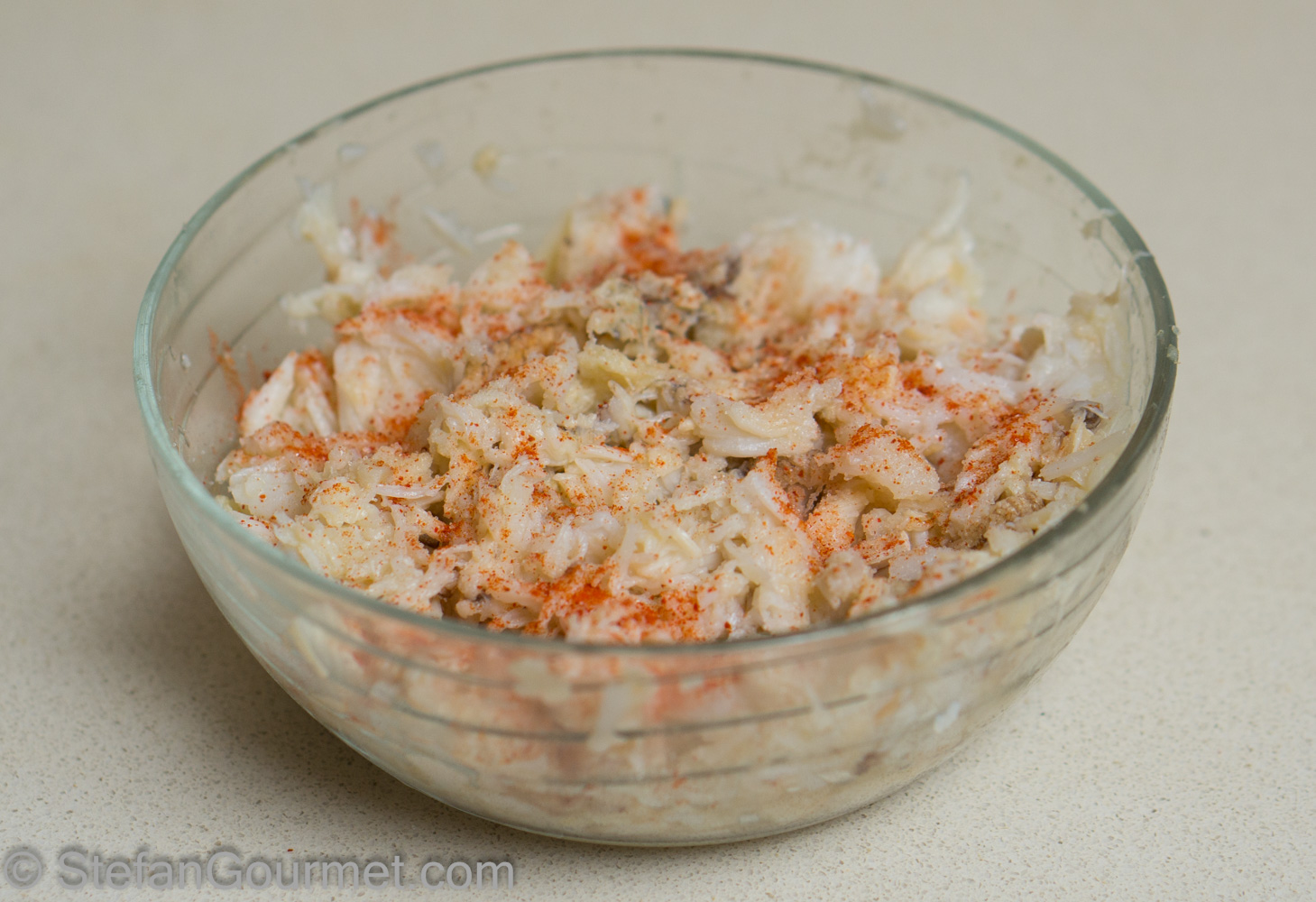 Once you have picked all the crab meat, put it in a bowl, season with salt and a dash of cayenne pepper, and add a few drops of lemon juice. Stir, taste, and adjust the seasoning if needed.