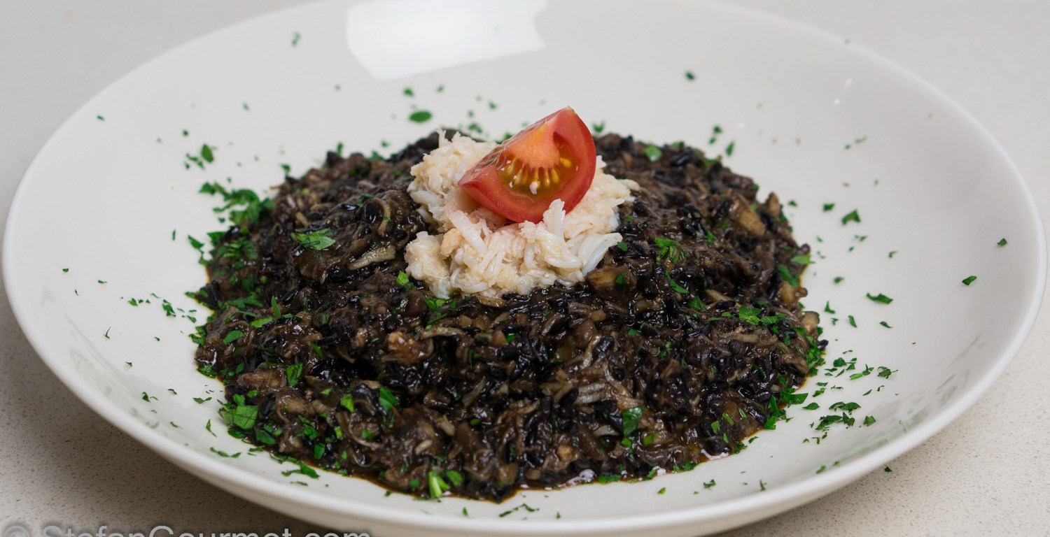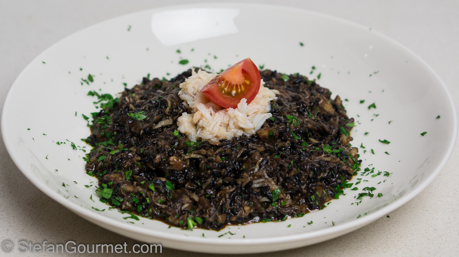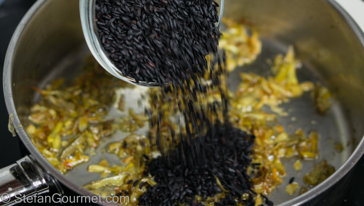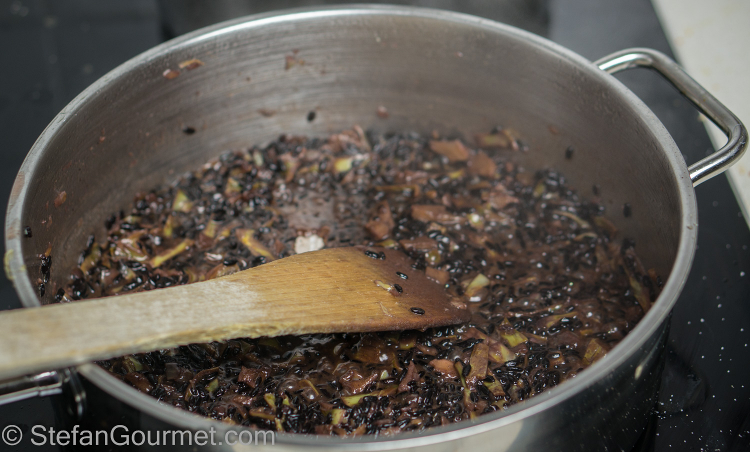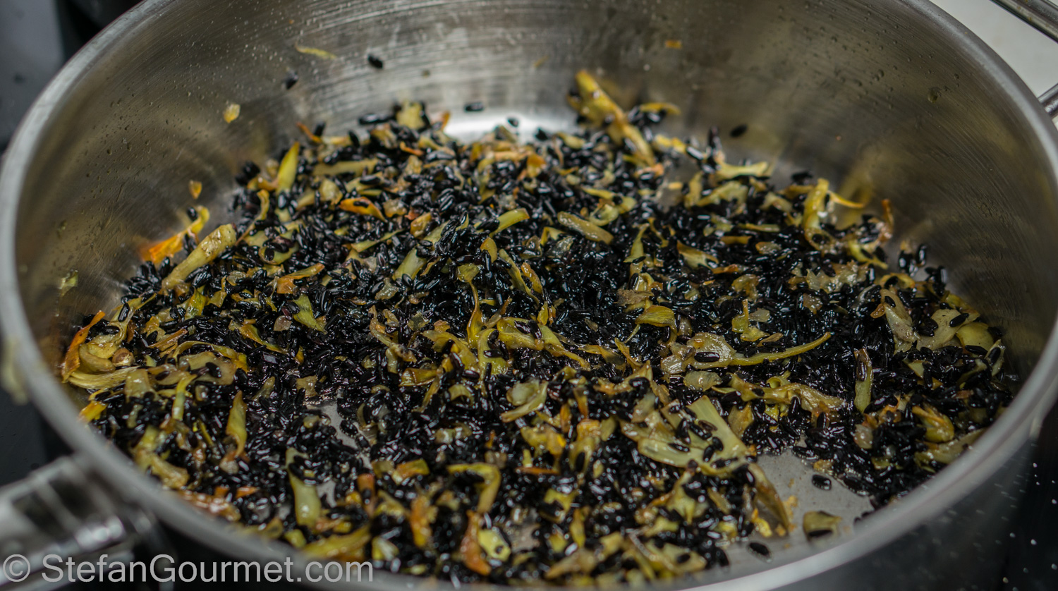 This post was inspired by two of my blogging friends. The idea to use riso venere, black rice, came from ChgoJohn. Black risotto can be made in two ways: by using squid ink to make ordinary risotto black, or by using this black rice. It is a wholegrain type of rice that takes longer to cook and has a great flavor and texture.