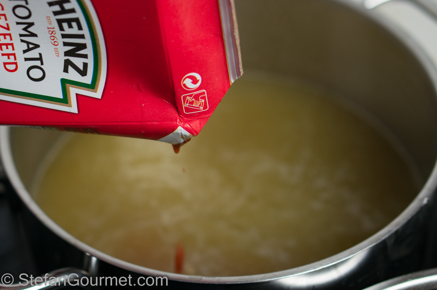 Add the tomato puree to the stock, and stir to incorporate. Season with salt. Keep the stock simmering.
