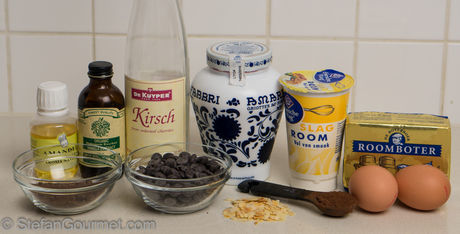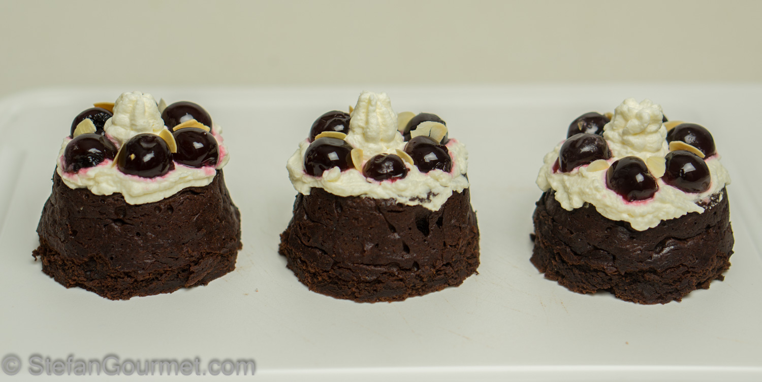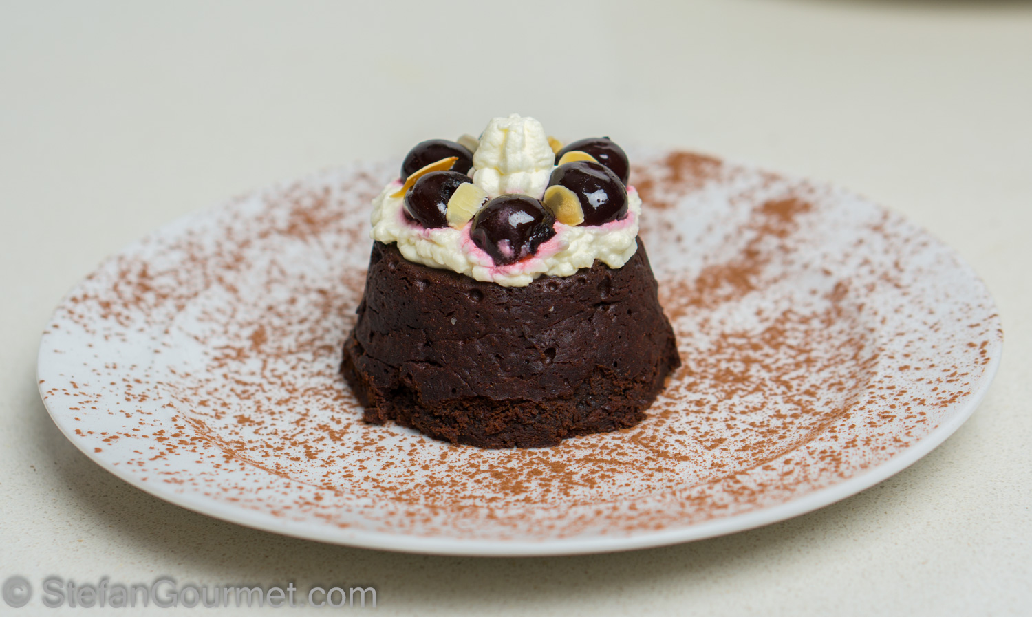This recipe is an embellishment on the easy flourless chocolate cake I posted about recently. I decorated the cake with whipped cream and amarena cherries, and used the syrup of the amarena cherries for the cake batter instead of hot espresso coffee. The result is that the chocolate cake obtains a great deep and dark fruitiness from the cherry syrup, and the combination of the cherries with the chocolate cake is wonderful. The cream lightens up things a bit (although of course not in terms of calories). In terms of preparation it is almost as easy as the simple flourless chocolate cake, except of course for the decorating part.