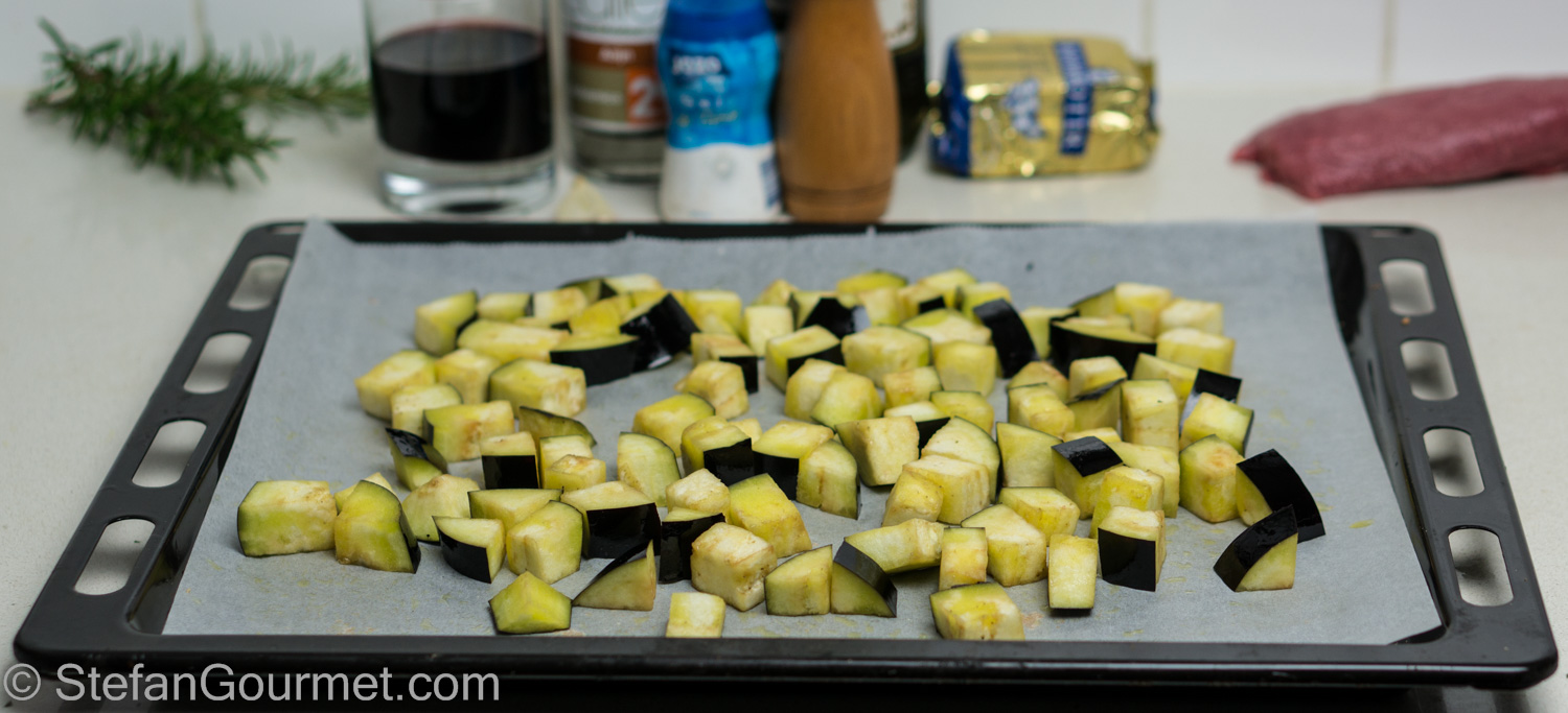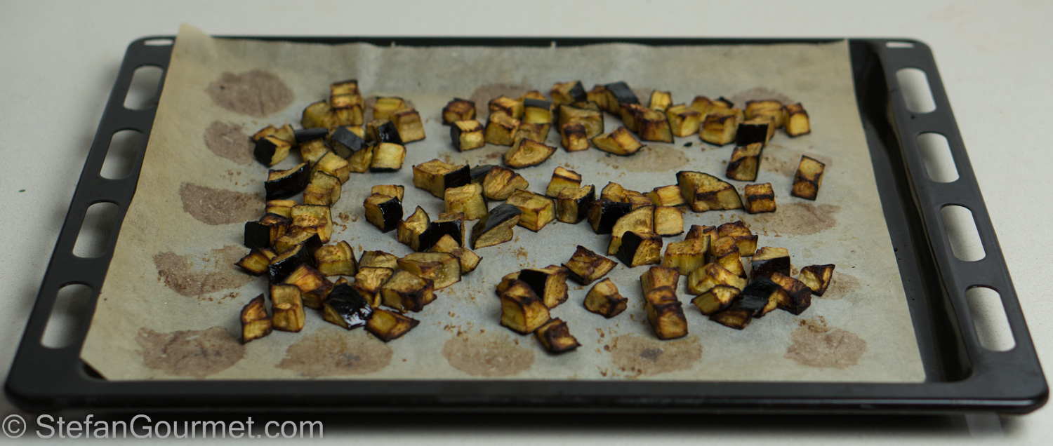 Preheat the oven to 225ºC/440ºF. Wash and dry the eggplant. Cut both ends off and dice the eggplant (about 2 cm or 3/4 inch dice).