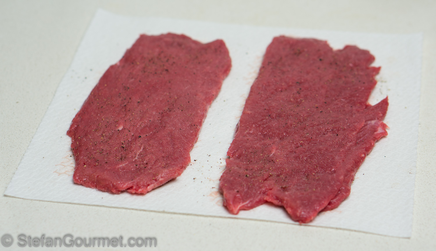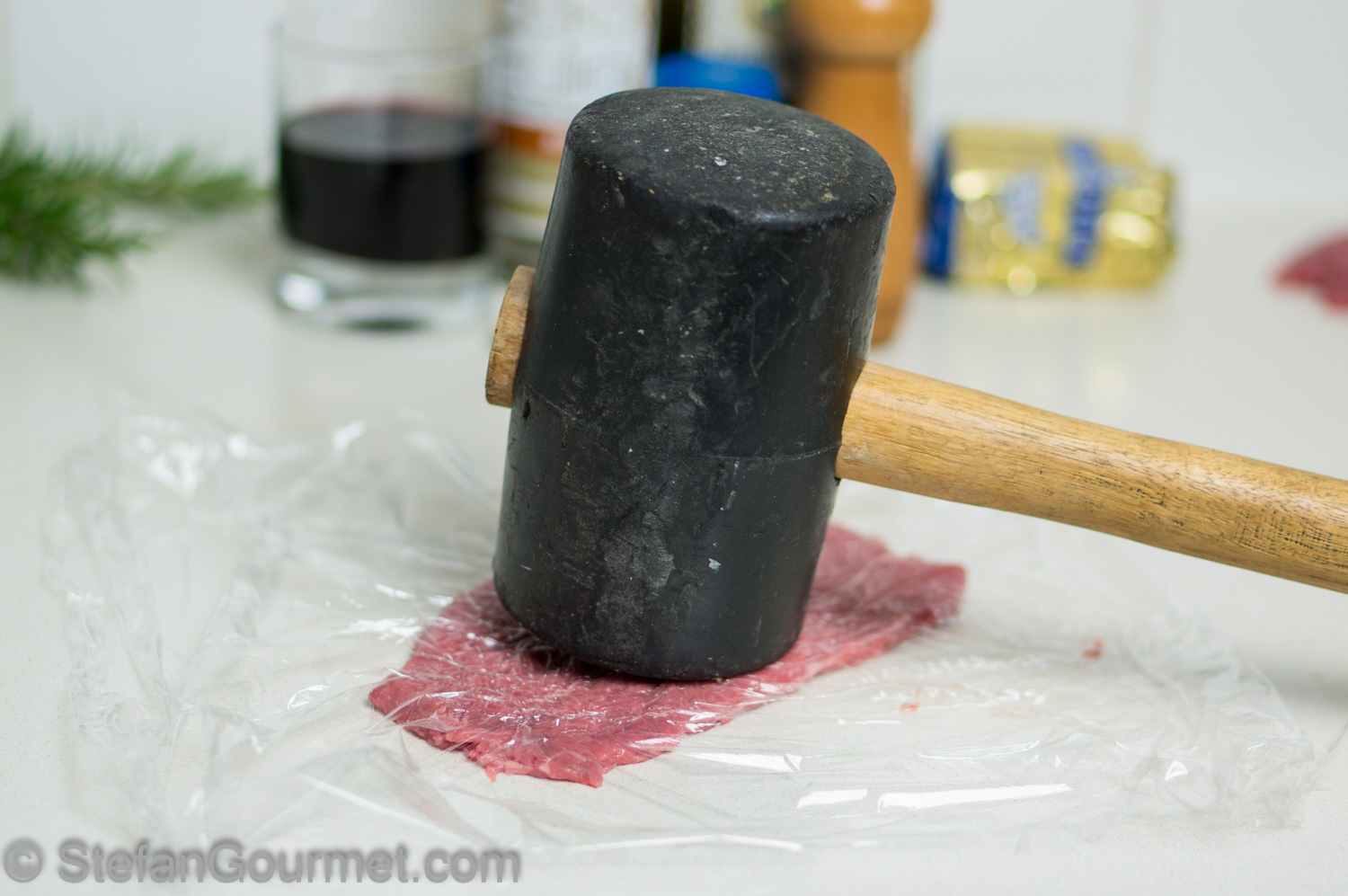 Meanwhile, pound the lamb thin between two sheets of plastic wrap with a meat hammer. (I appropriated Kees’ rubber hammer that he uses for the pavement in the yard, and that works fine, too.) You want the meat to be between 4 and 6 mm (between 1/6 and 1/4 inch).