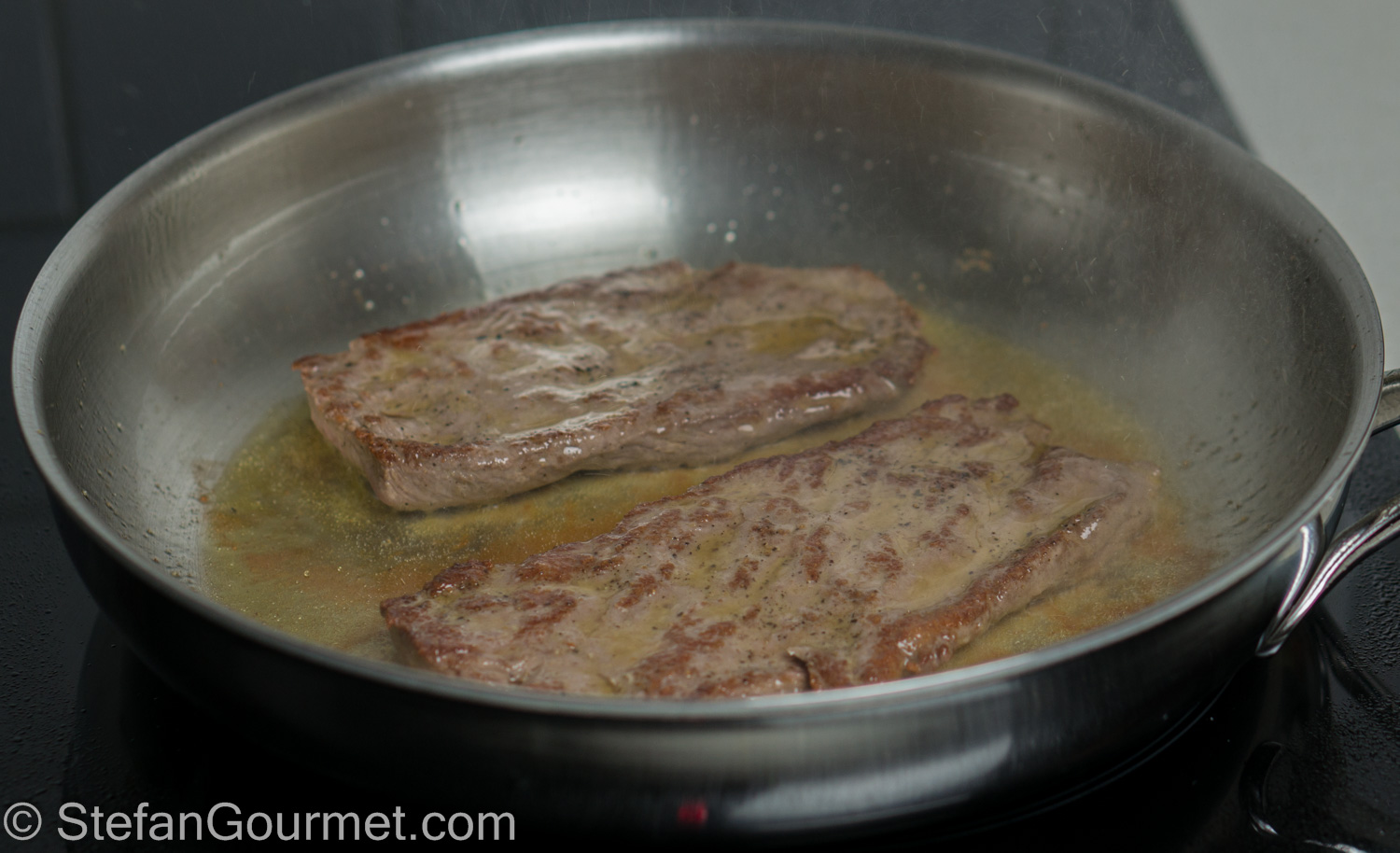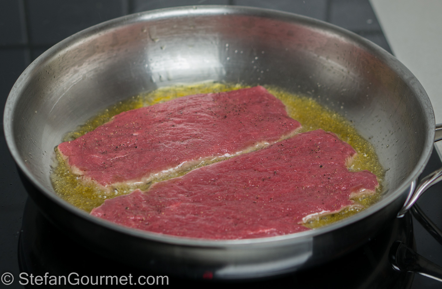 Put the pan back on the heat and when the oil is hot, add the lamb scaloppine. Cook them about a minute over high heat.