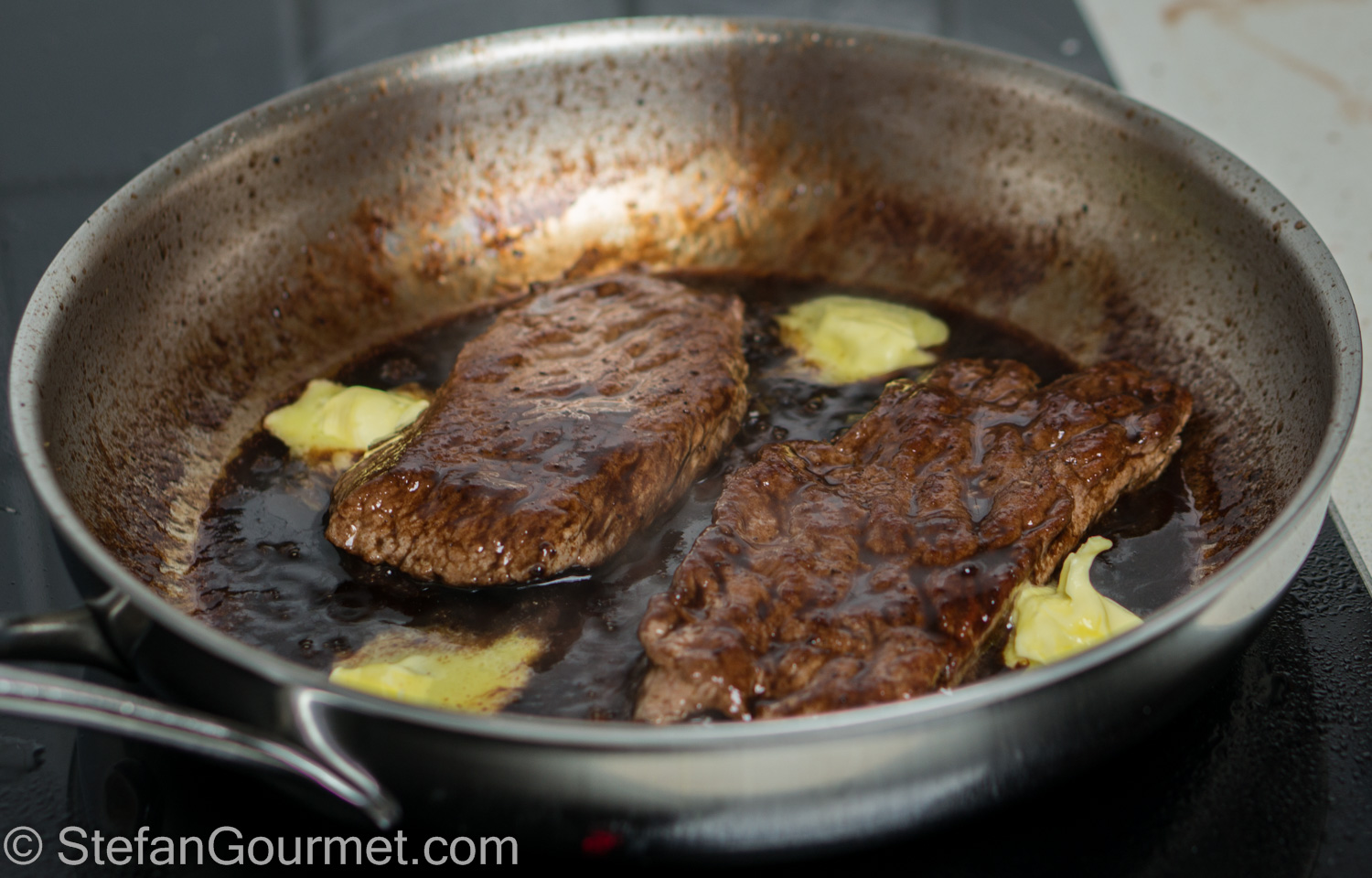 Stir in a tablespoon of butter in smaller pieces. Cover the lamb with the sauce and allow to warm through briefly without overcooking the lamb.