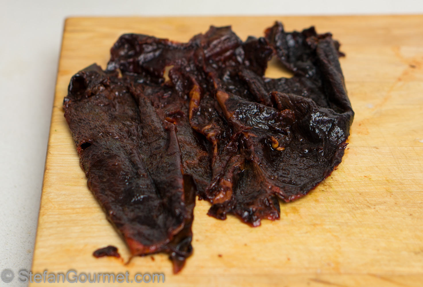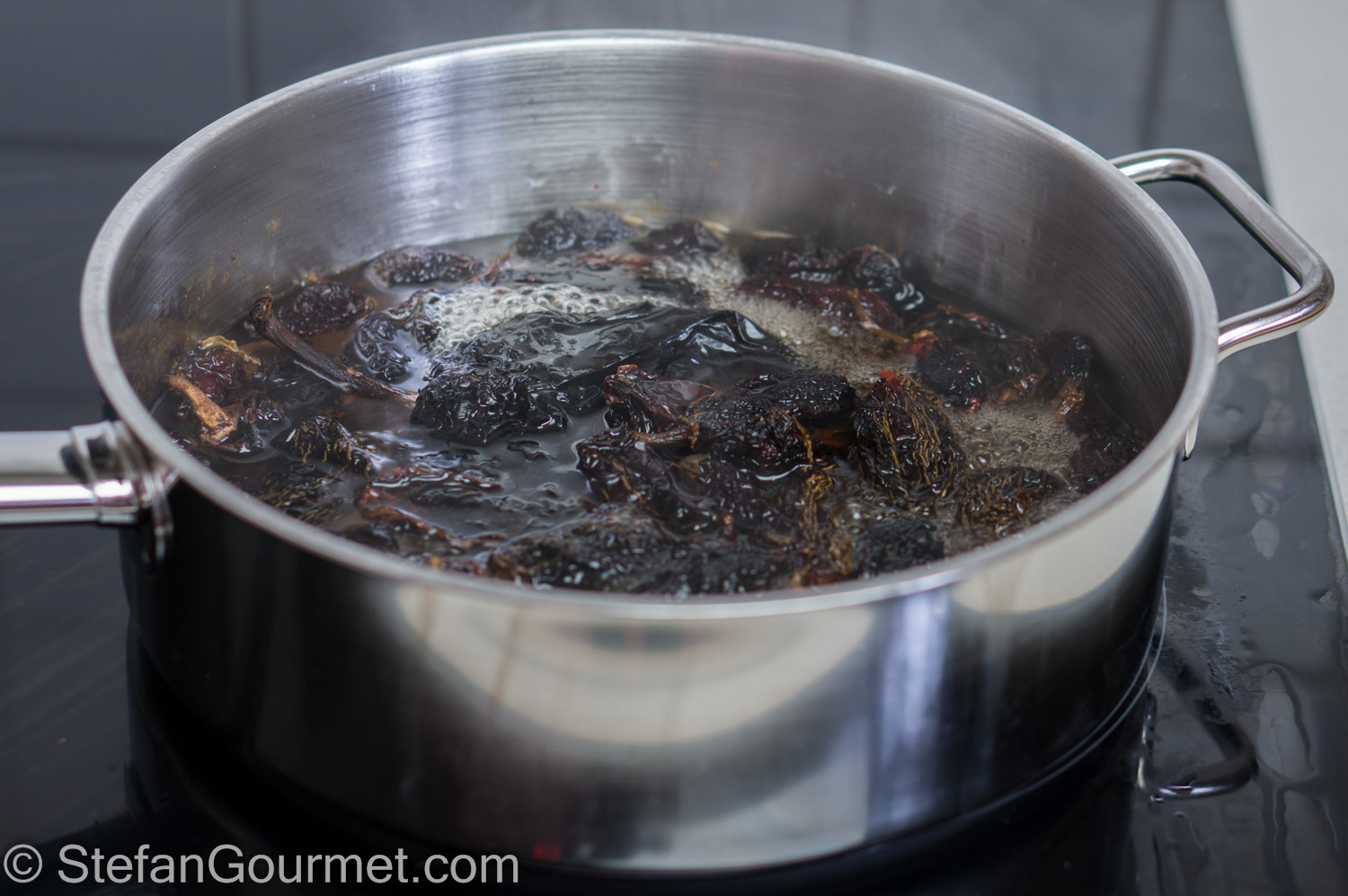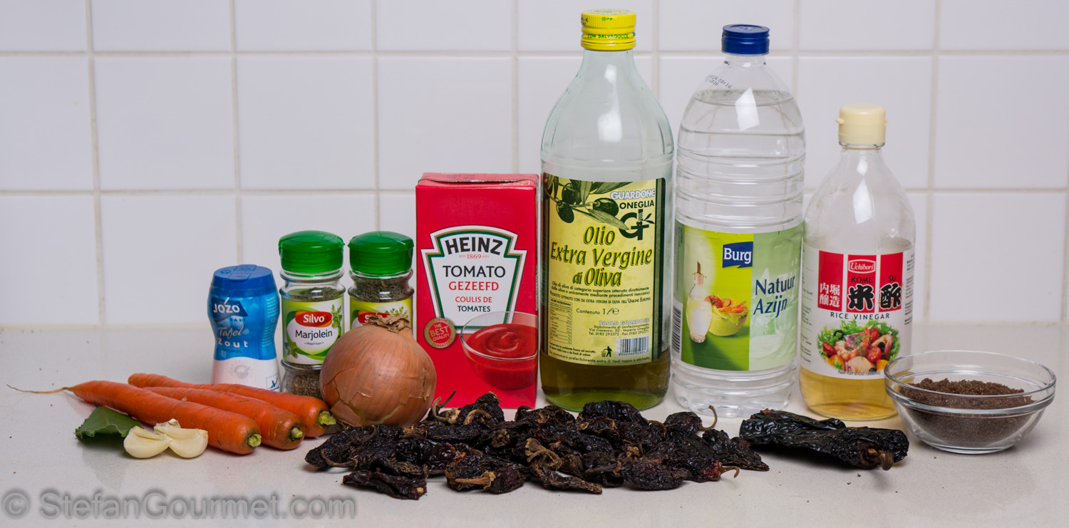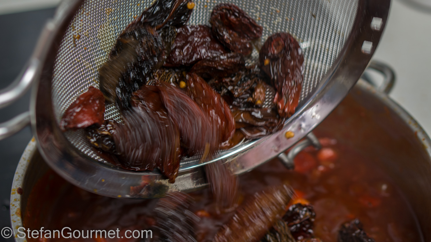 My favorite kind of chiles are chipotles because of their smokiness. Chipotles in adobo sauce, a sauce made from tomatoes and ancho chiles, are a great condiment. I love them for instance with chicken, mushrooms and cream. Chipotles in adobo sauce are available in cans, but since I like to make everything from scratch, I wanted to try making my own chipotles in adobo. I used a recipe by Pati’s Mexican table. It wasn’t hard at all, and the result was amazing. Chipotles in adobo from a can are great, but these homemade chipotles in adobo sauce have a more complex and well-rounded flavor. I will definitely make them again. I made a few adjustments, most importantly not using fresh tomatoes because they are out of season (and even if they were in season, tomatoes here are not that great). Here’s my version.