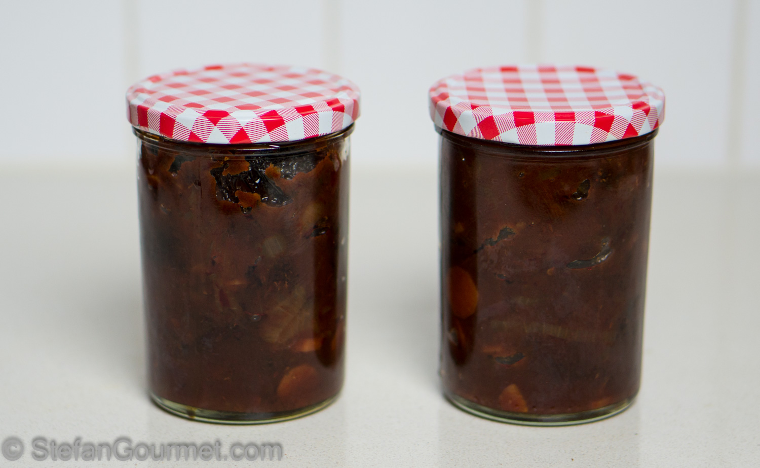 Transfer to jars when still hot, and allow to cool in the jars standing on the lid (so the hot sauce will sterilize the lids). Store in the refrigerator.