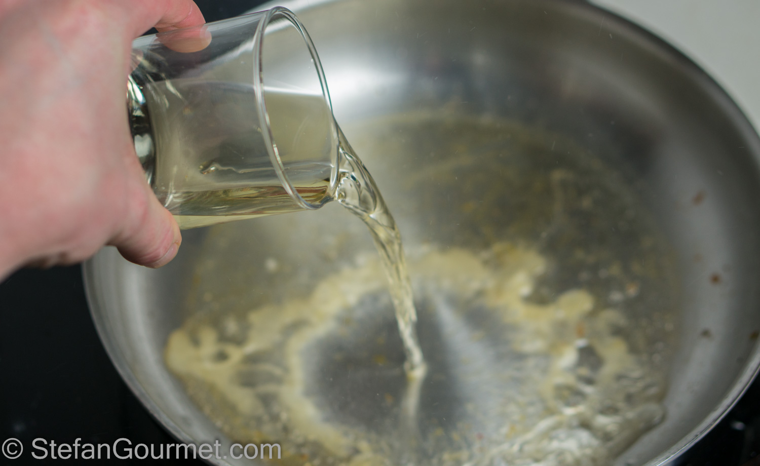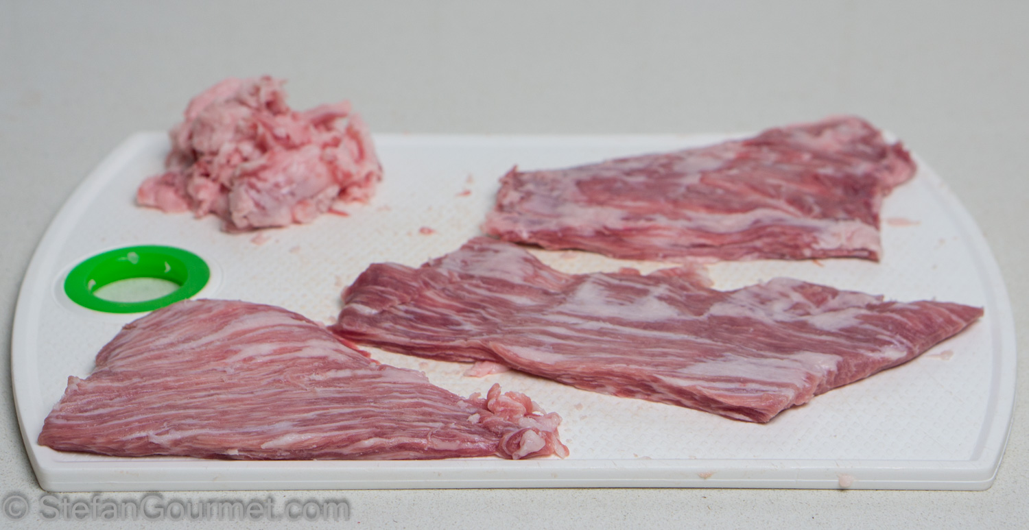 From one piece of secreto, usually about 650 grams or 1.5 lbs, you can cut about 3 scaloppine and enough fat to brown all of them. If they don’t have an even thickness, you can use a rubber hammer and pound the meat into an even thickness between two sheets of plastic wrap.