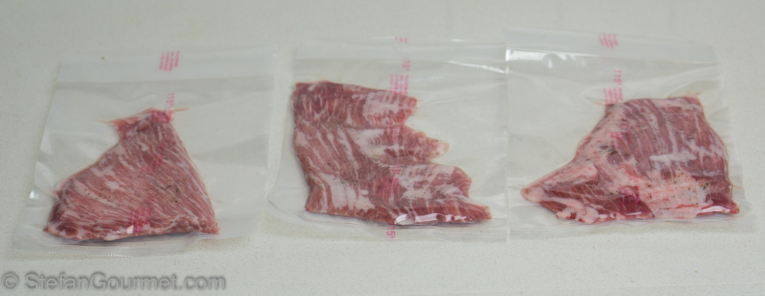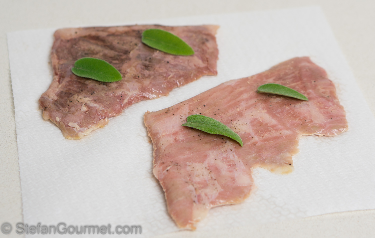 “Secreto” is a cut of iberico pork that is called the “butcher’s secret”. It is very flavorful and marbled, and fairly thin. So thin in fact, that it made me think of veal scaloppine. One of my favorite preparations of veal scaloppine is with prosciutto and sage, and is called saltimbocca. And iberico pork is most famous for its jamón, Spanish prosciutto. So I thought, why not try to make secreto iberico saltimbocca? (Perhaps it would be appropriate to translate saltimbocca into Spanish, i.e. saltenboca.) The only problem is that veal scaloppine are cut from a very tender part of veal, and cook in minutes. Secreto would be a bit tough if cooked the same way. And so I decided to cook the secreto sous-vide first, which I have done successfully before for 24 hours at 57ºC/135ºF.