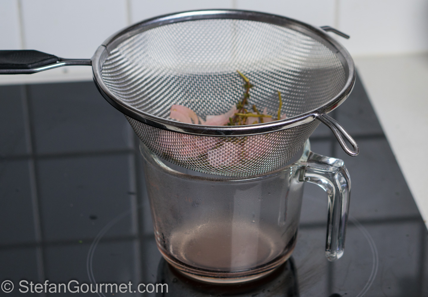 Strain the liquid, pushing down on the shallots. (In Belgium and the Netherlands this liquid is called gastrique, but in France that is something else entirely to make things confusing.)