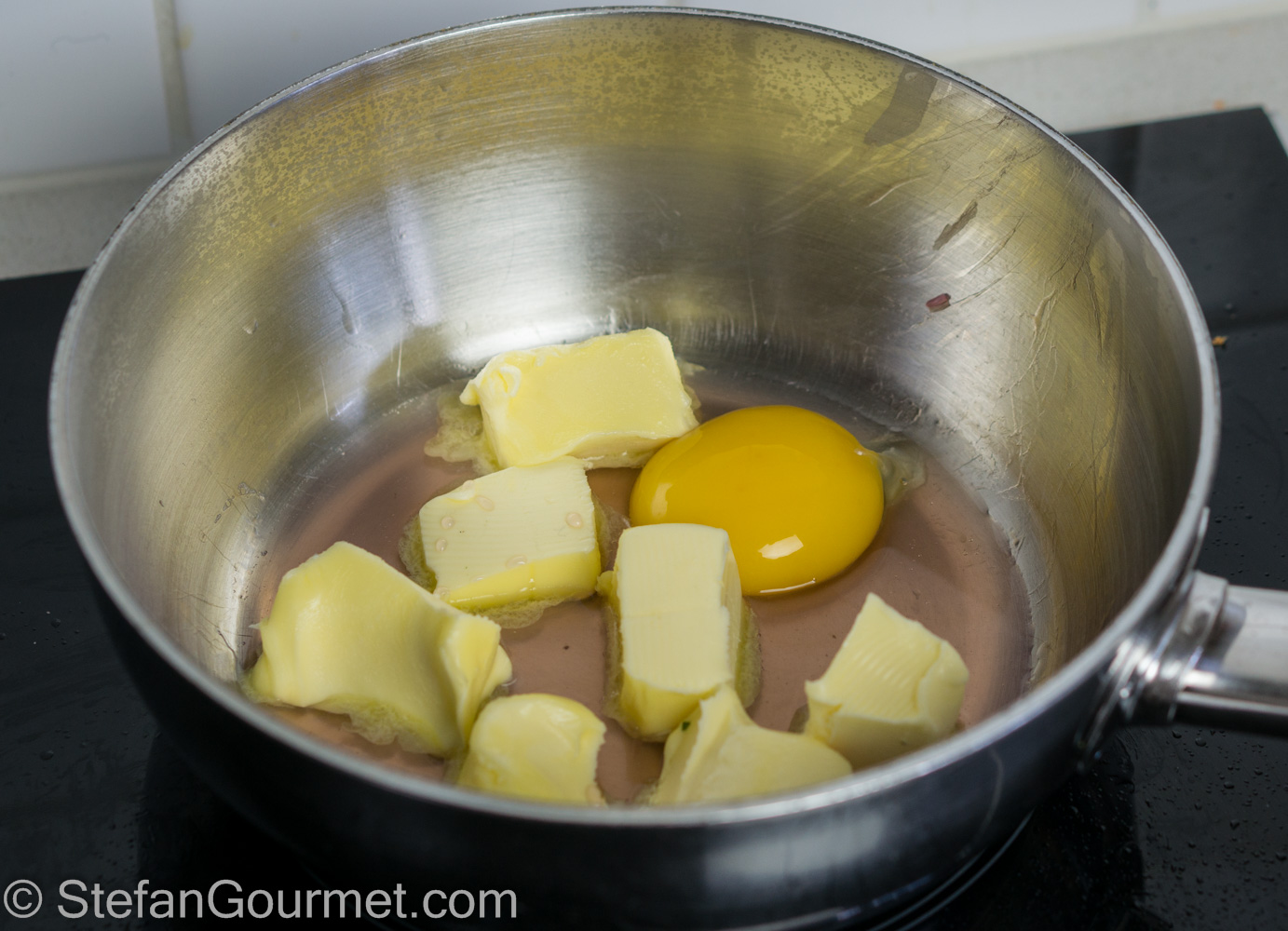 Allow the saucepan and the liquid to cool somewhat. When they are below 50ºC or 120ºF (so the egg yolk won’t cook), put the egg yolk in the saucepan and add the strained liquid.