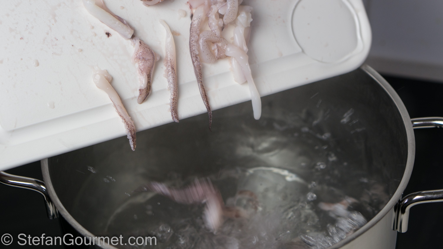 Io di solito non bollisco i tentacoli, li salto direttamente in padella. 🙂