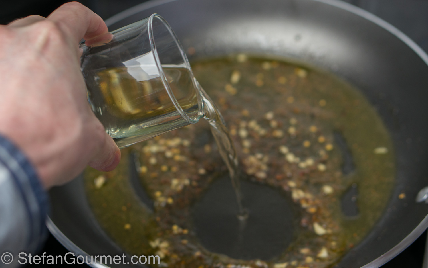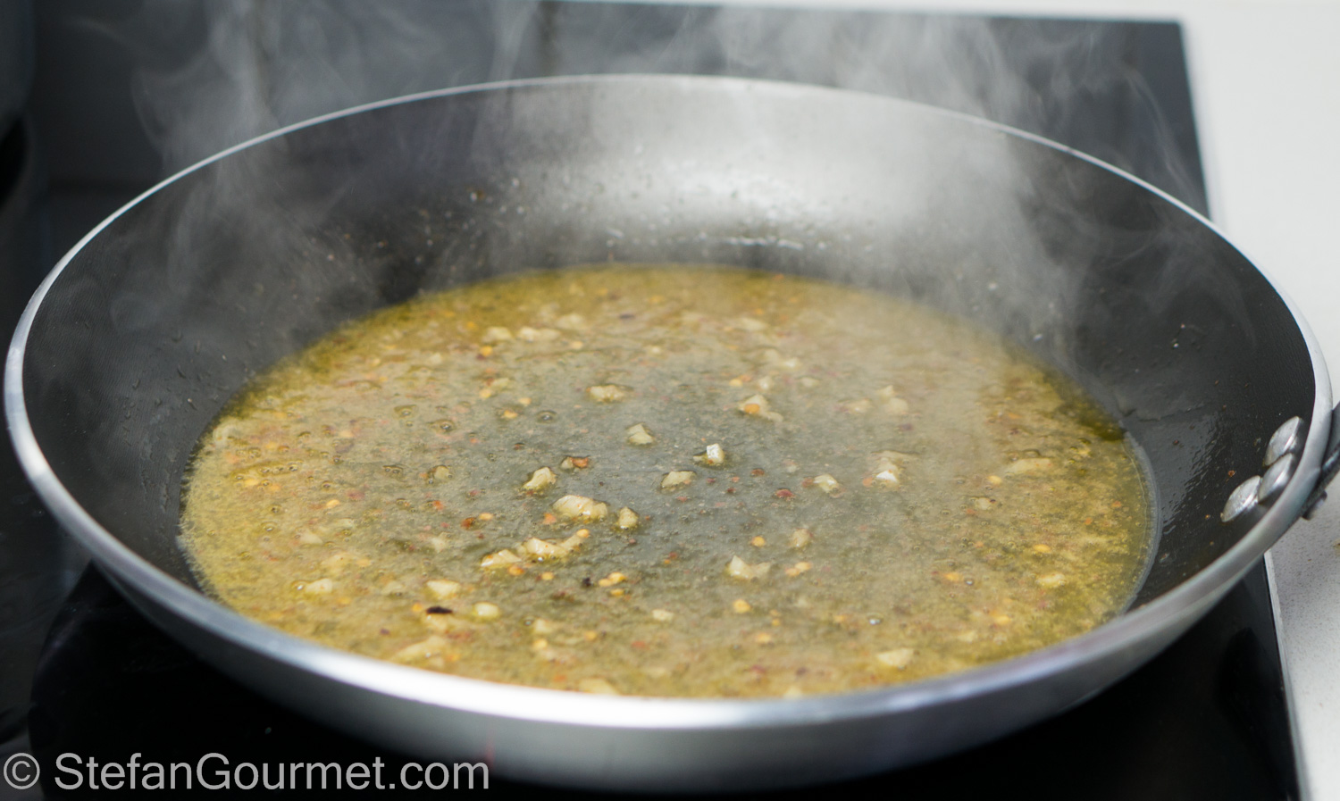 Meanwhile, heat the olive oil in a frying pan. Add the garlic, anchovies, and chilli flakes.