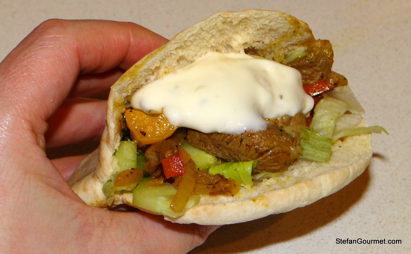 Shawarma (or shoarma as it is called in the Netherlands) is Middle-Eastern way of preparing meat with spices on a vertical spit, which is subsequently served in pita bread with salad and garlic sauce. It is a fast food staple around the world, and not something you’d expect to read about on a foodie blog such as this. Most places that sell shoarma in the Netherlands have their peak hours in the middle of the night on weekends, when people get hungry after having drunk a lot of beer. If you were the owner of a shawarma place and you were serving your fare mostly to customers who are too drunk to care, would you care about the quality of what you are serving? I’ve had such a shawarma sandwich (broodje shoarma) on a few occasions, but never cared much for the soggy, greasy, overspiced and overgarlicked concoction with a taste that lingered way too long. Not surprisingly however, it turns out that if you make a shawarma sandwich from scratch, it is actually outstandingly delicious! And when I say from scratch, I really mean from scratch, including baking your own pita bread.