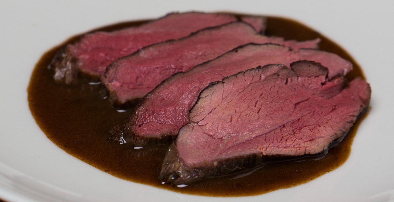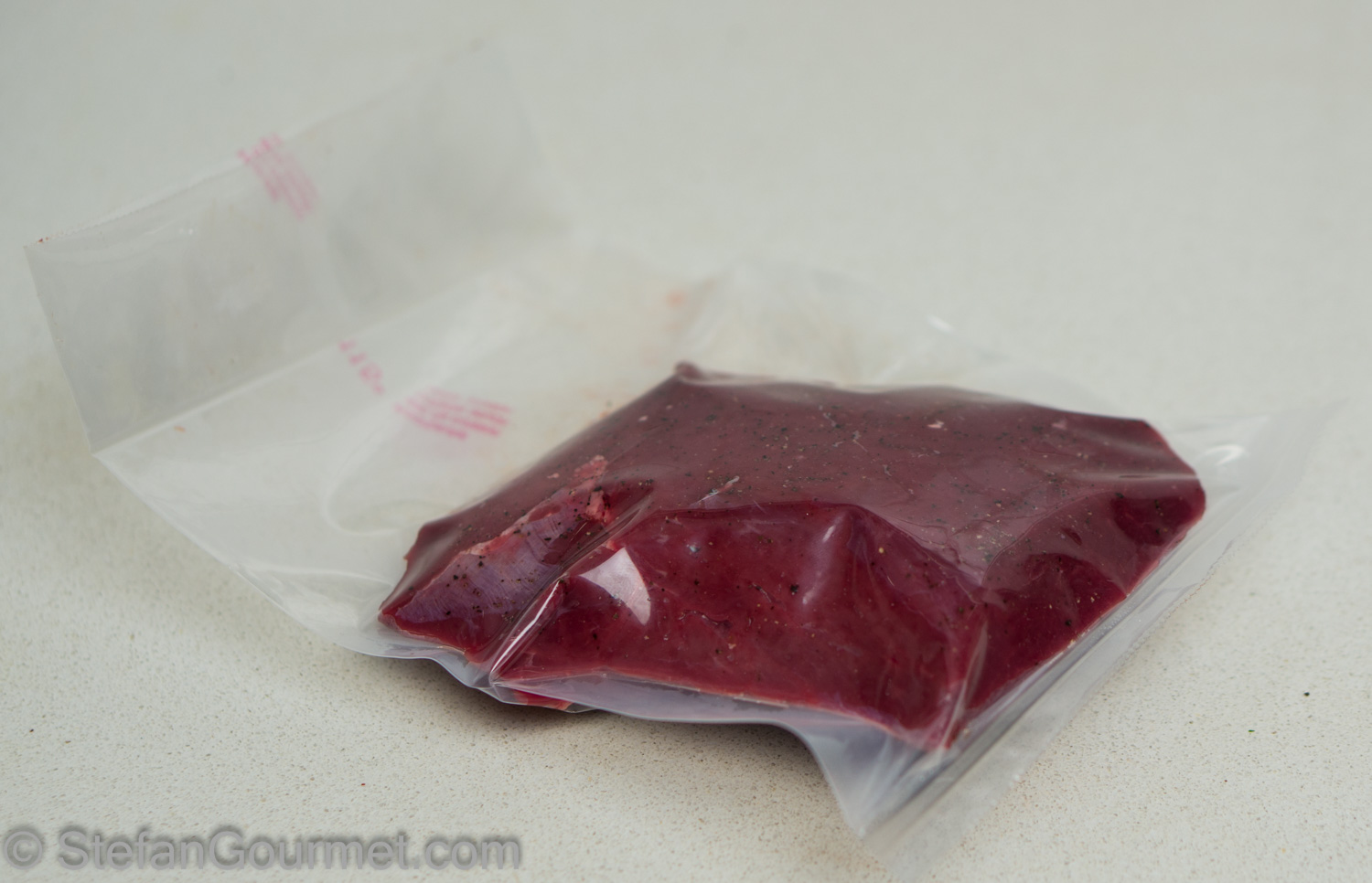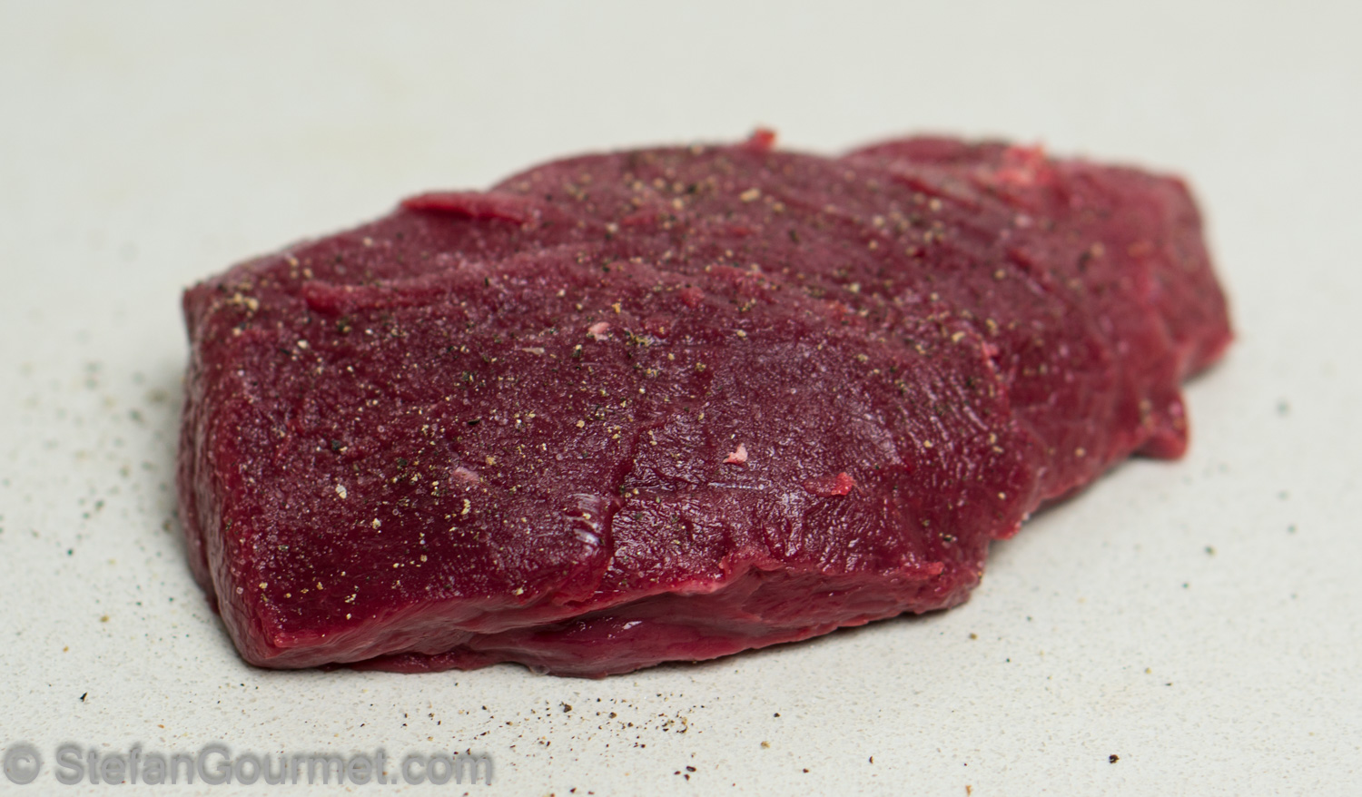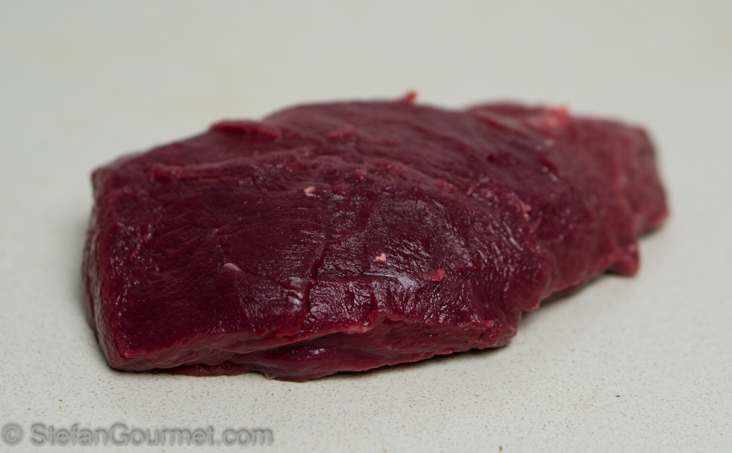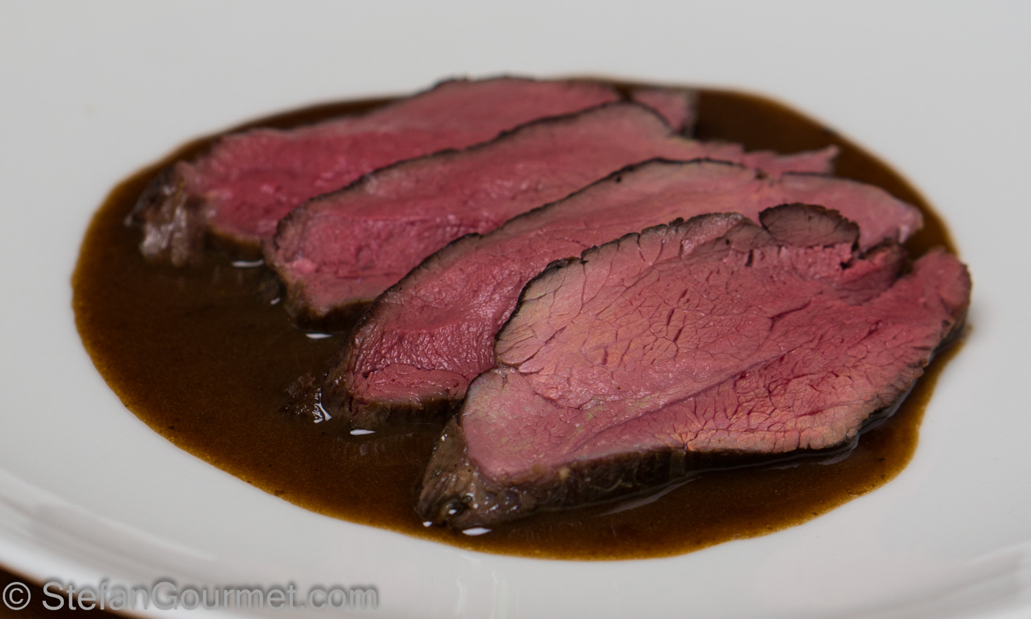 Cooking an unfamiliar cut of meat sous-vide is always a bit exciting, as I am always looking for the perfect combination of time and temperature to make it as tender and juicy as possible. So I knew it was show time when I picked up a bolar roast (the Australian/New Zealand name for a cut that lies next to the ribs near the shoulder) of New Zealand farmed venison. Since this is farmed venison of young animals (not older than three years), I expected it to be relatively tender and decided to choose the lowest possible temperature of 55ºC/131ºF (going below that time would not be safe for longer cooking times) and a relatively short time of 8 hours. It worked like a charm: the meat was perfect. A longer time and/or higher temperature would turn it to mush. Here’s what I did, a very basic preparation that will allow the flavor of the venison to shine.