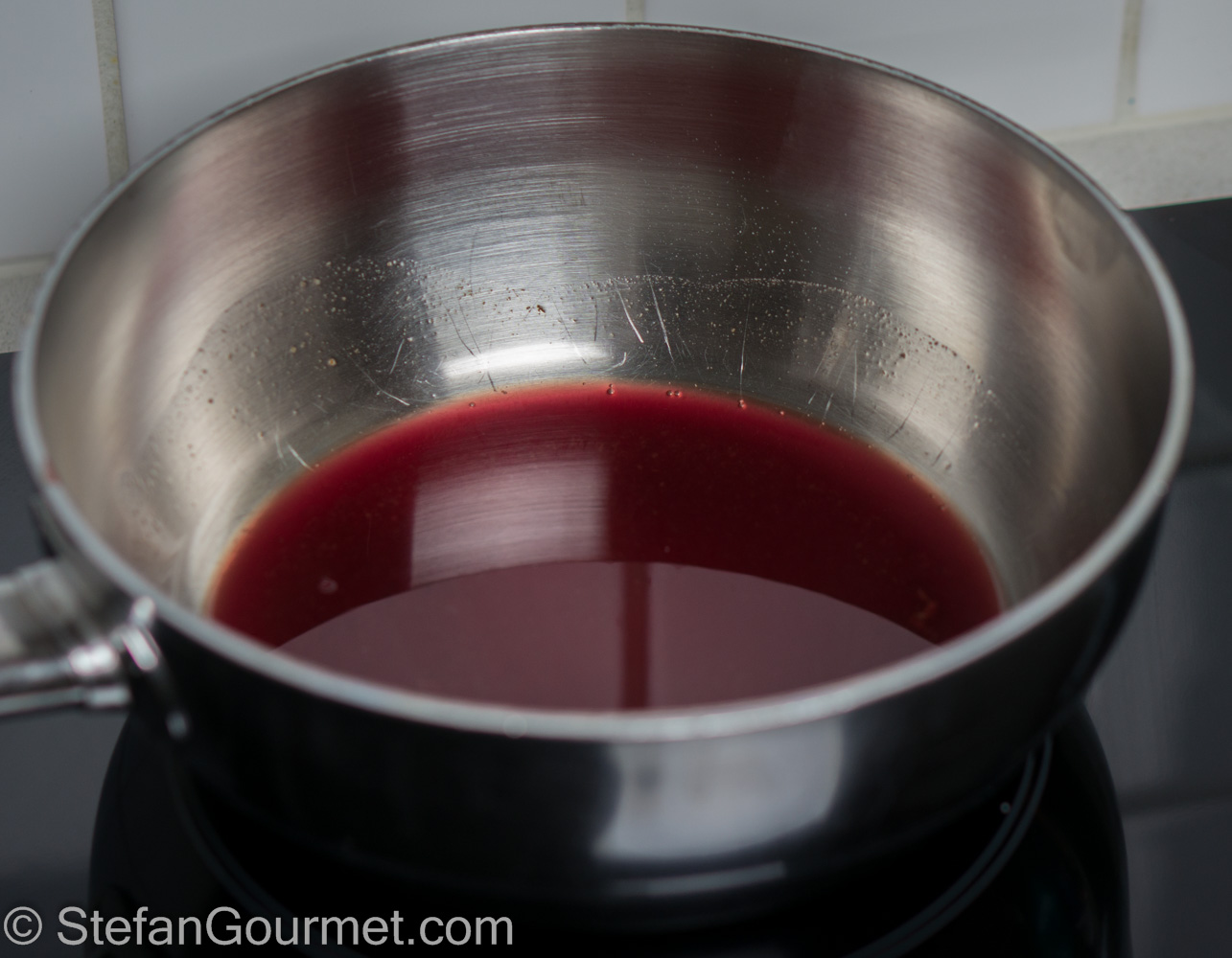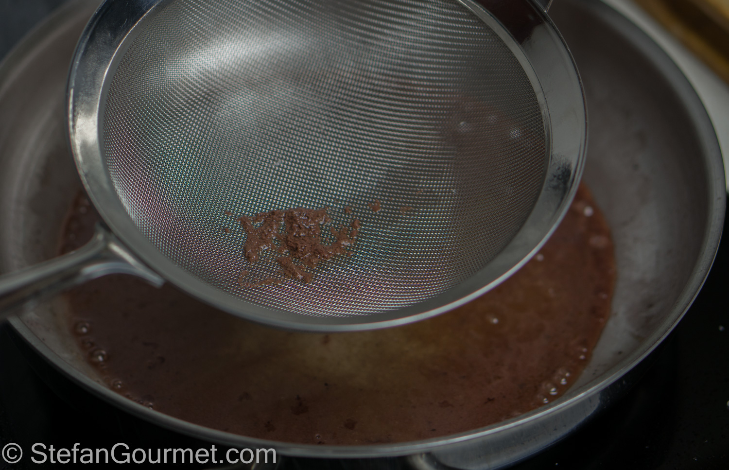 Strain the juices into the pan through a fine sieve. Bring to a boil and allow to reduce.