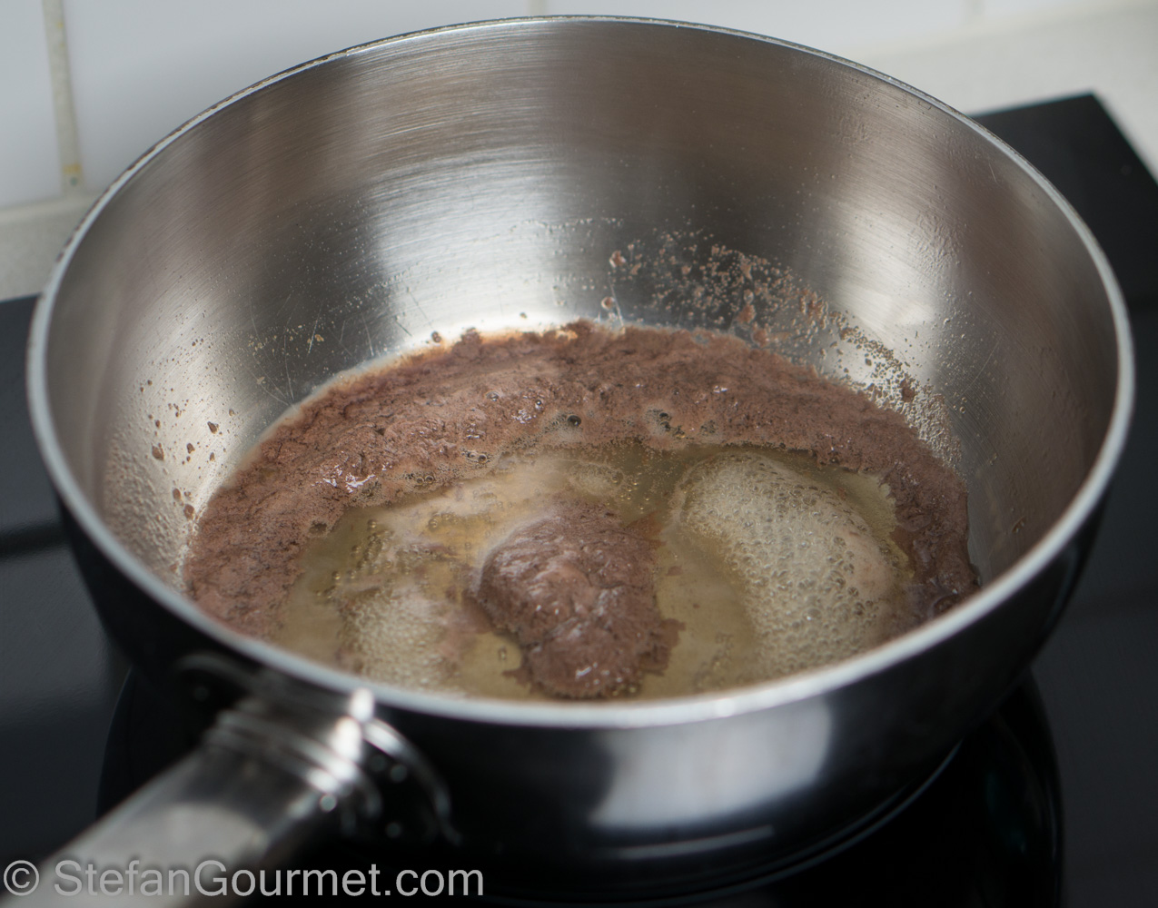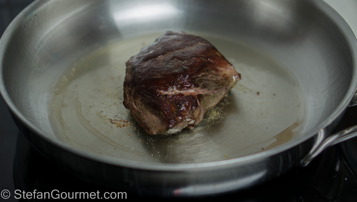 Brown the venison in clarified butter over very high heat. We don’t want to cook it as it is already cooked, just sear the outside to make it look better and to add some flavor. So just cook it until it is browned on all sides, a couple of minutes only.