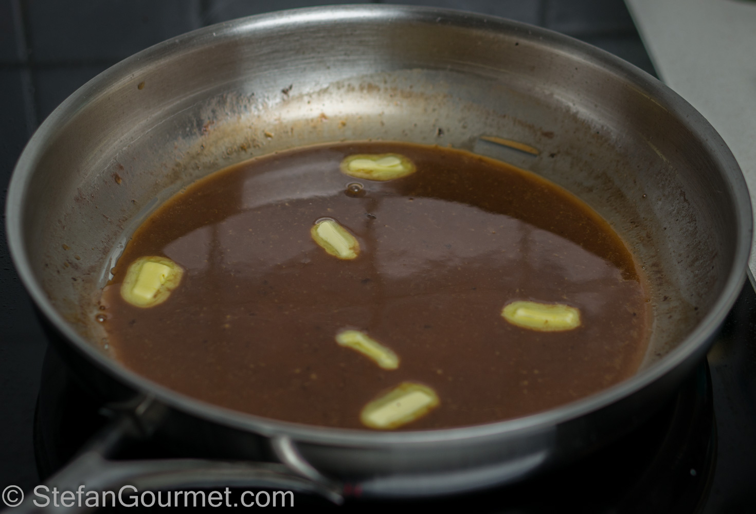 When the sauce has reduced to your liking, turn down the heat to very low and add some cold butter in small pieces. Whisk to include and slightly thicken the sauce (this is called mounting with butter).
