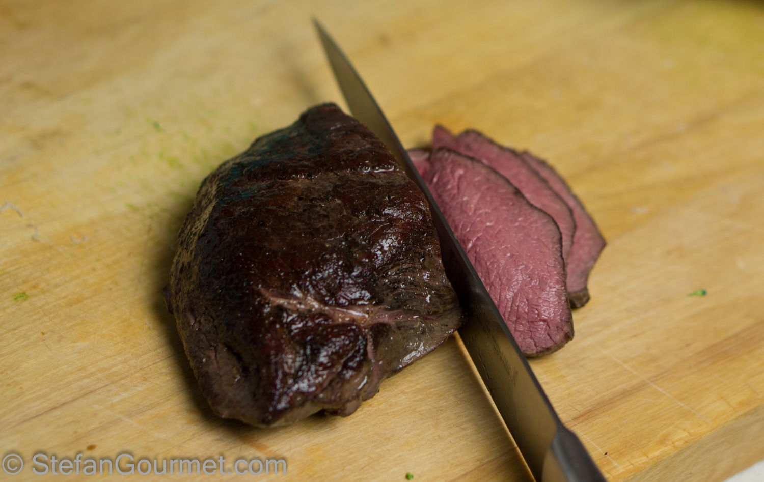 Look at that beautiful venison! You’ve previously told me that sous vide amplifies the existing flavour of the meat. How did it turn out with the strong flavour of venison? Would you say that it’s “gamier” than if cooked traditionally?