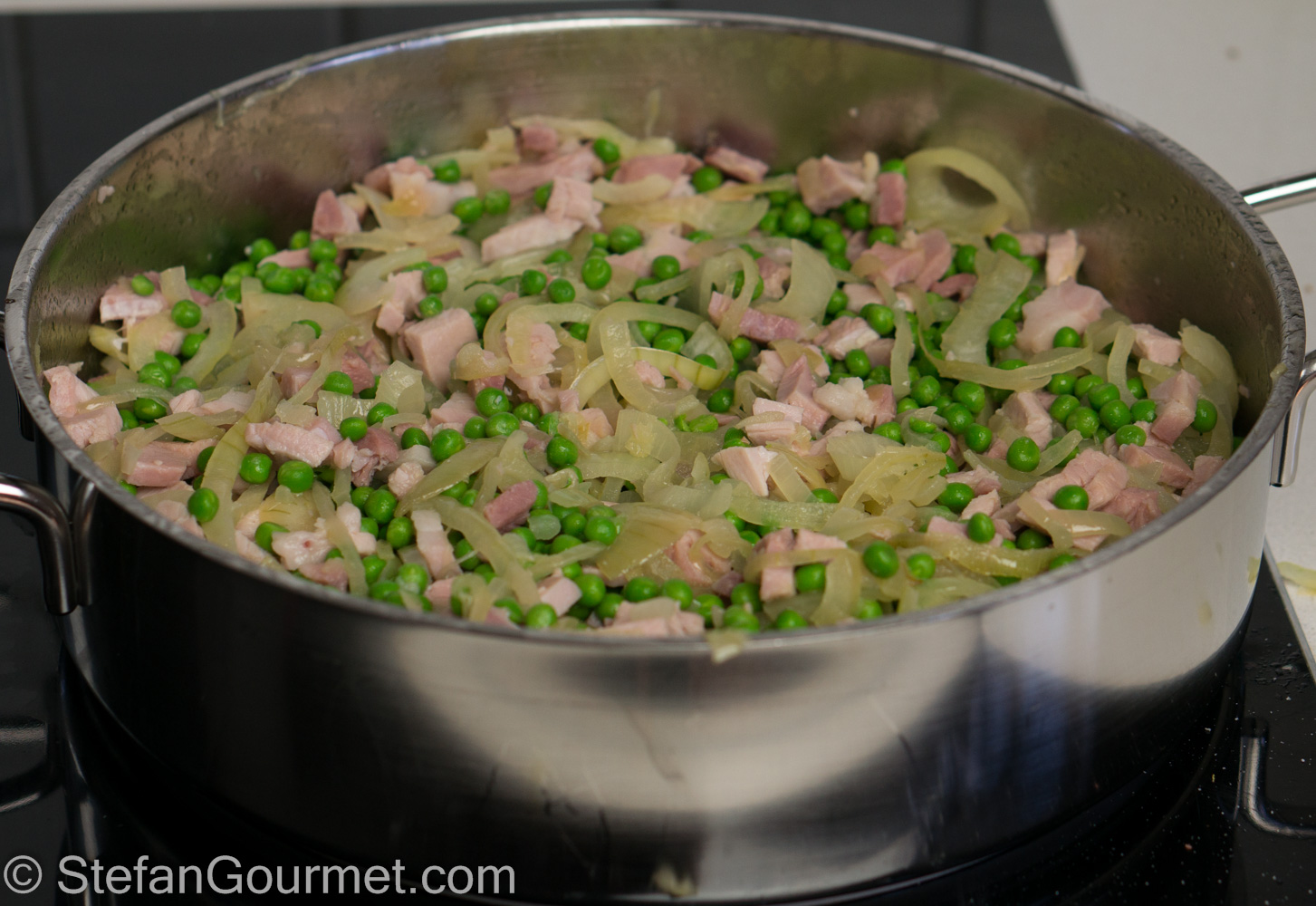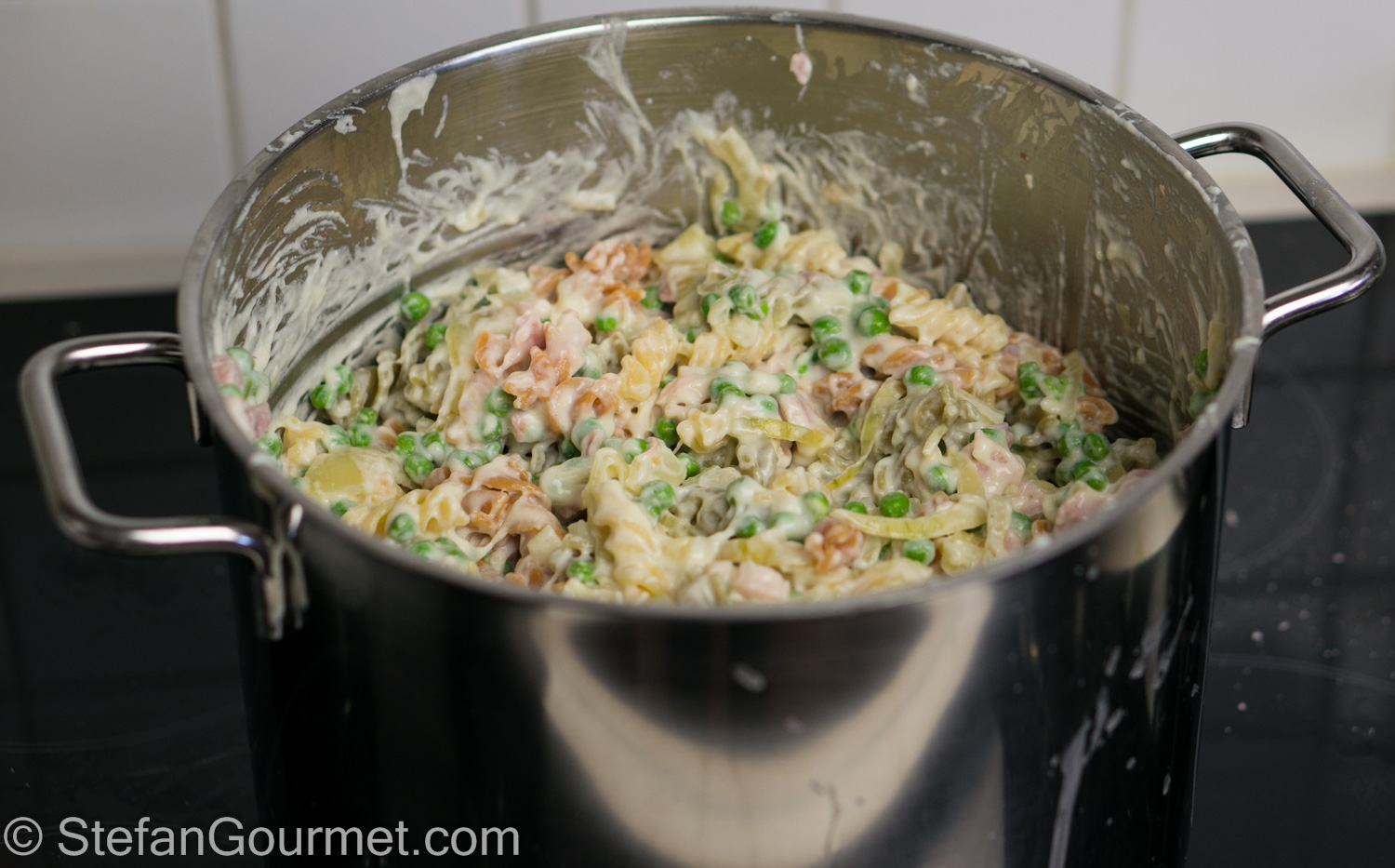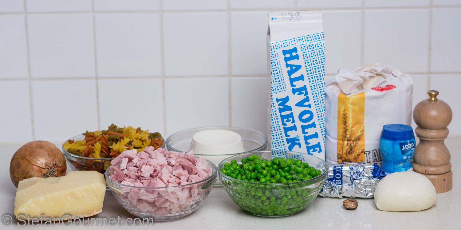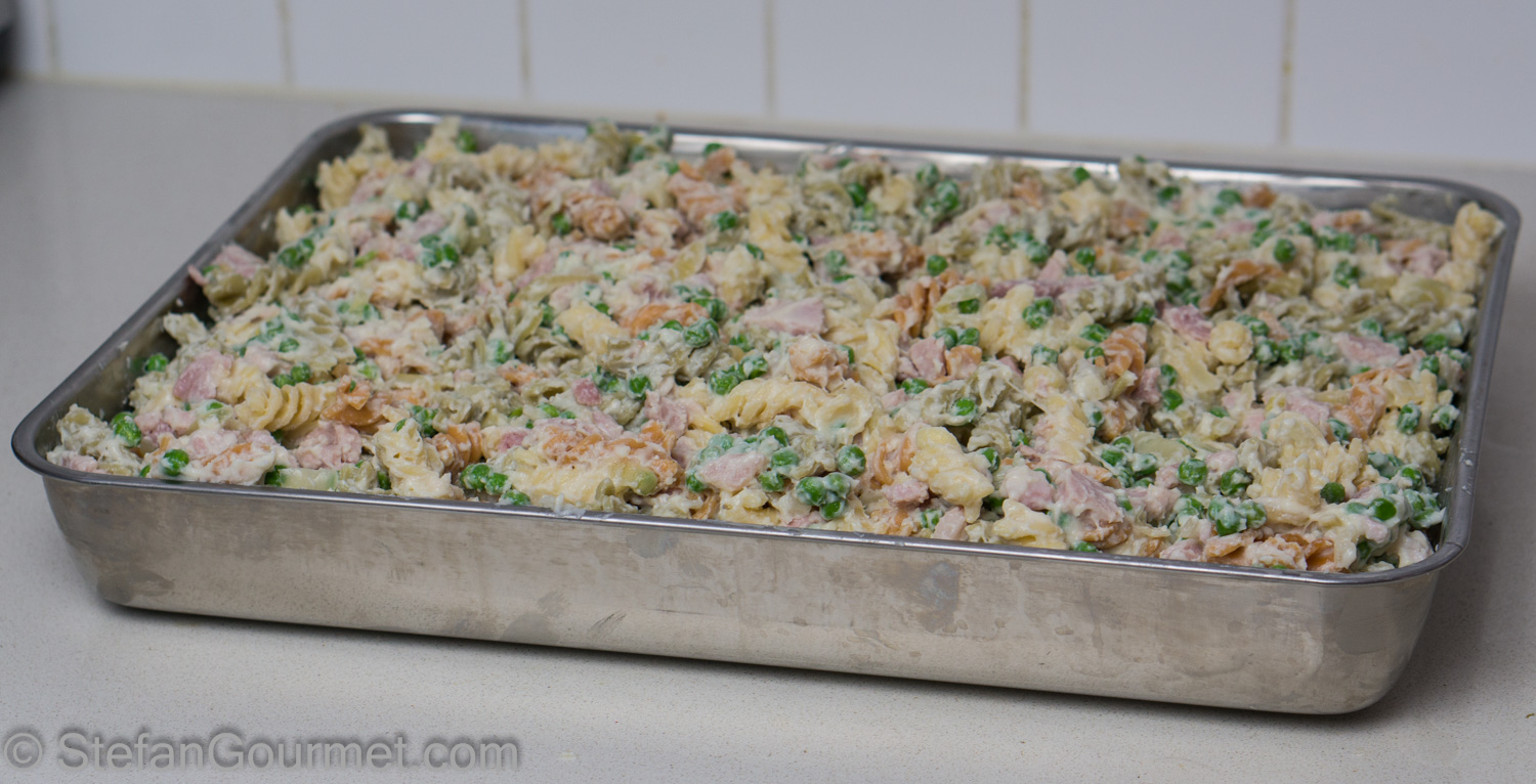 Combine the pasta, the bechamel sauce, and the ham-onions-peas mixture and stir until well mixed.
