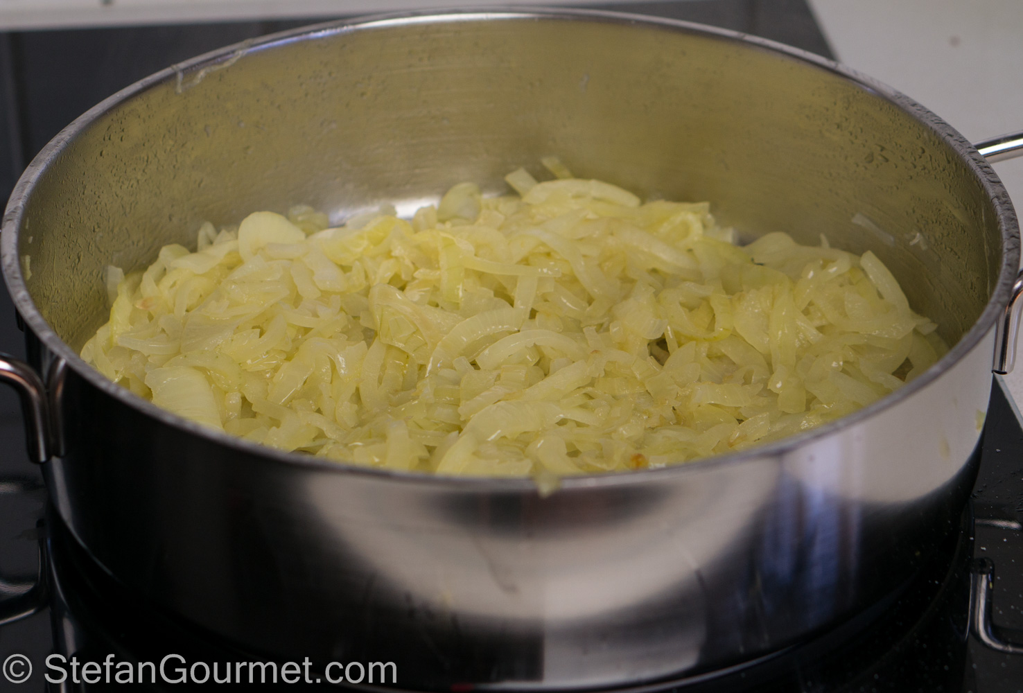 Cook the onions, stirring regularly, over medium heat until they are soft and slightly golden, about 15 minutes.