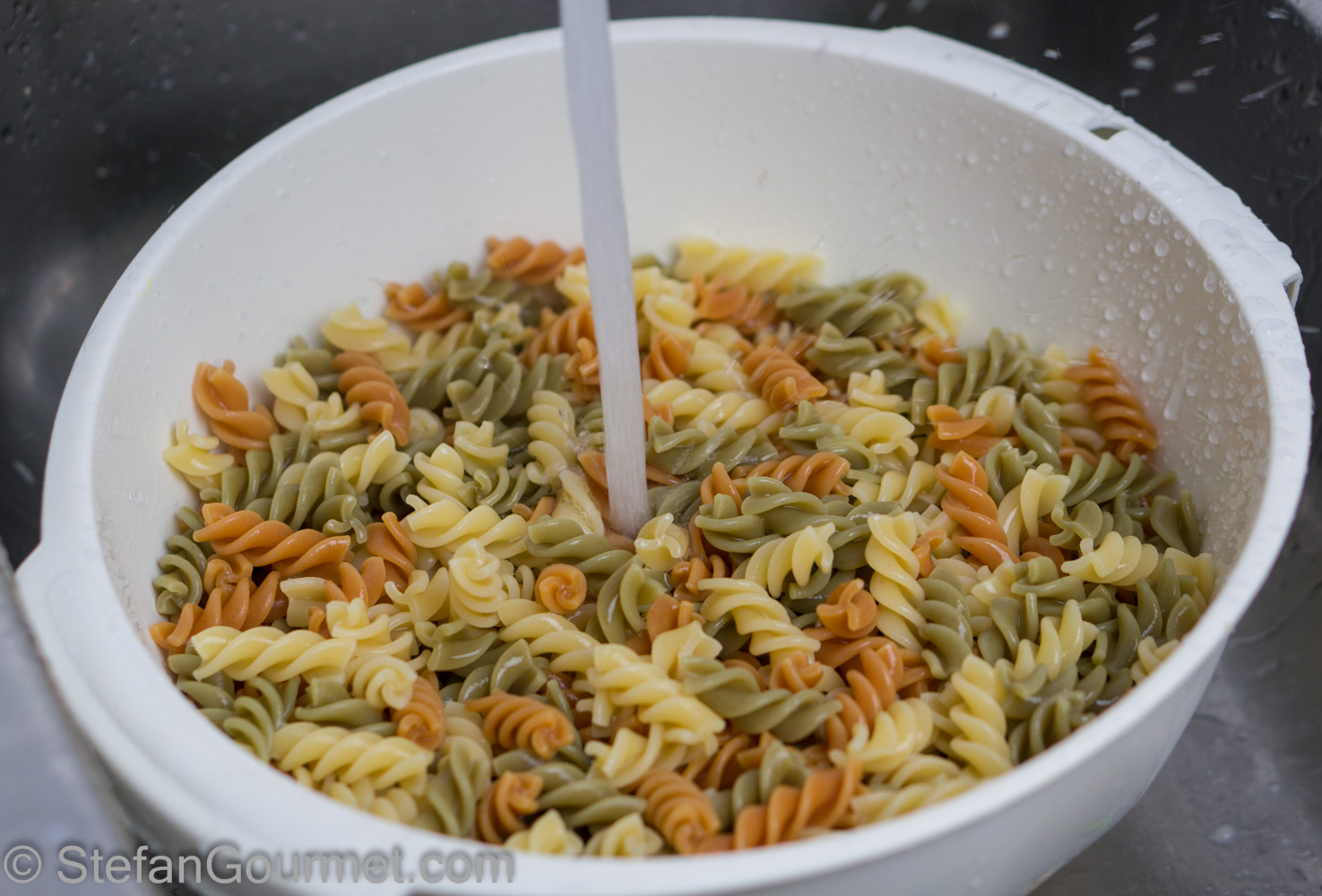 When the timer beeps, drain the pasta and rinse with cold water to stop the cooking.